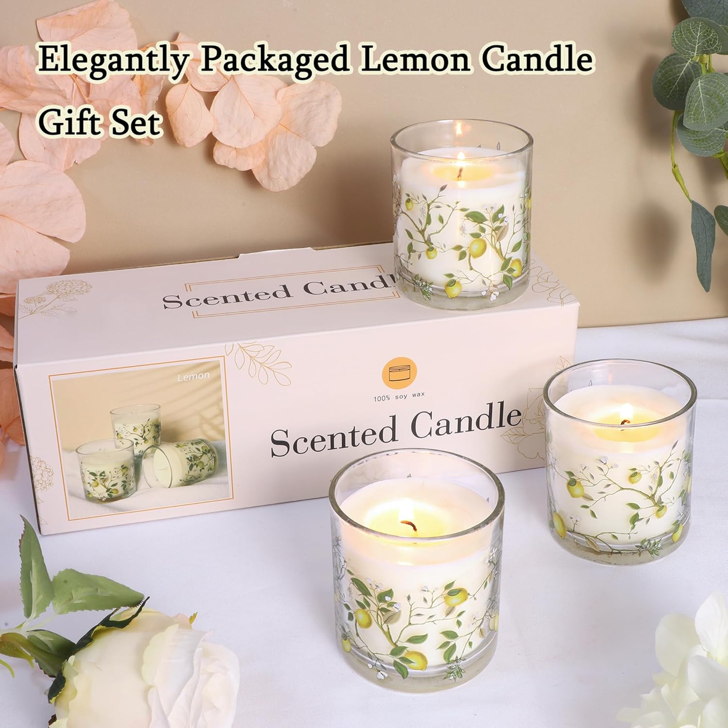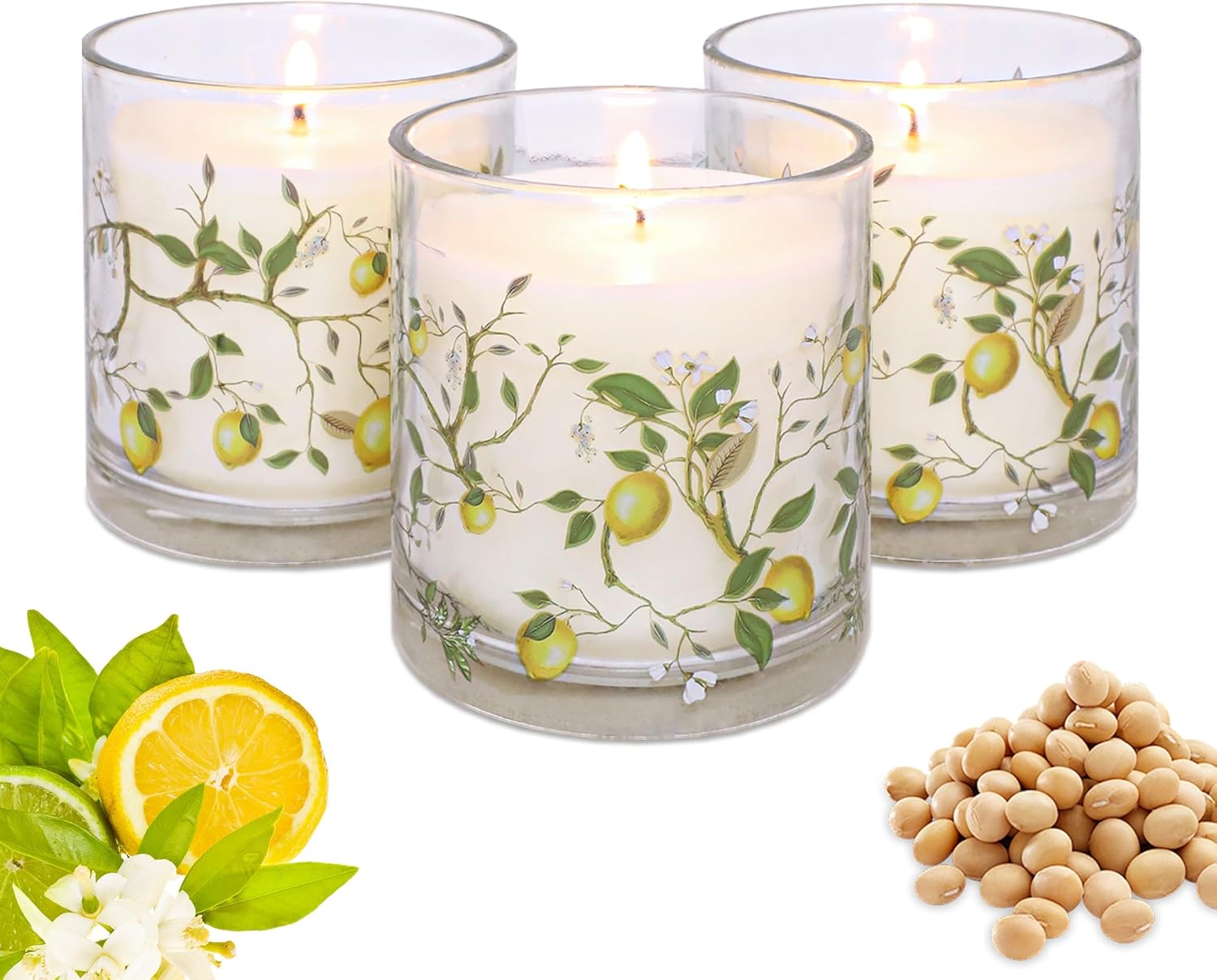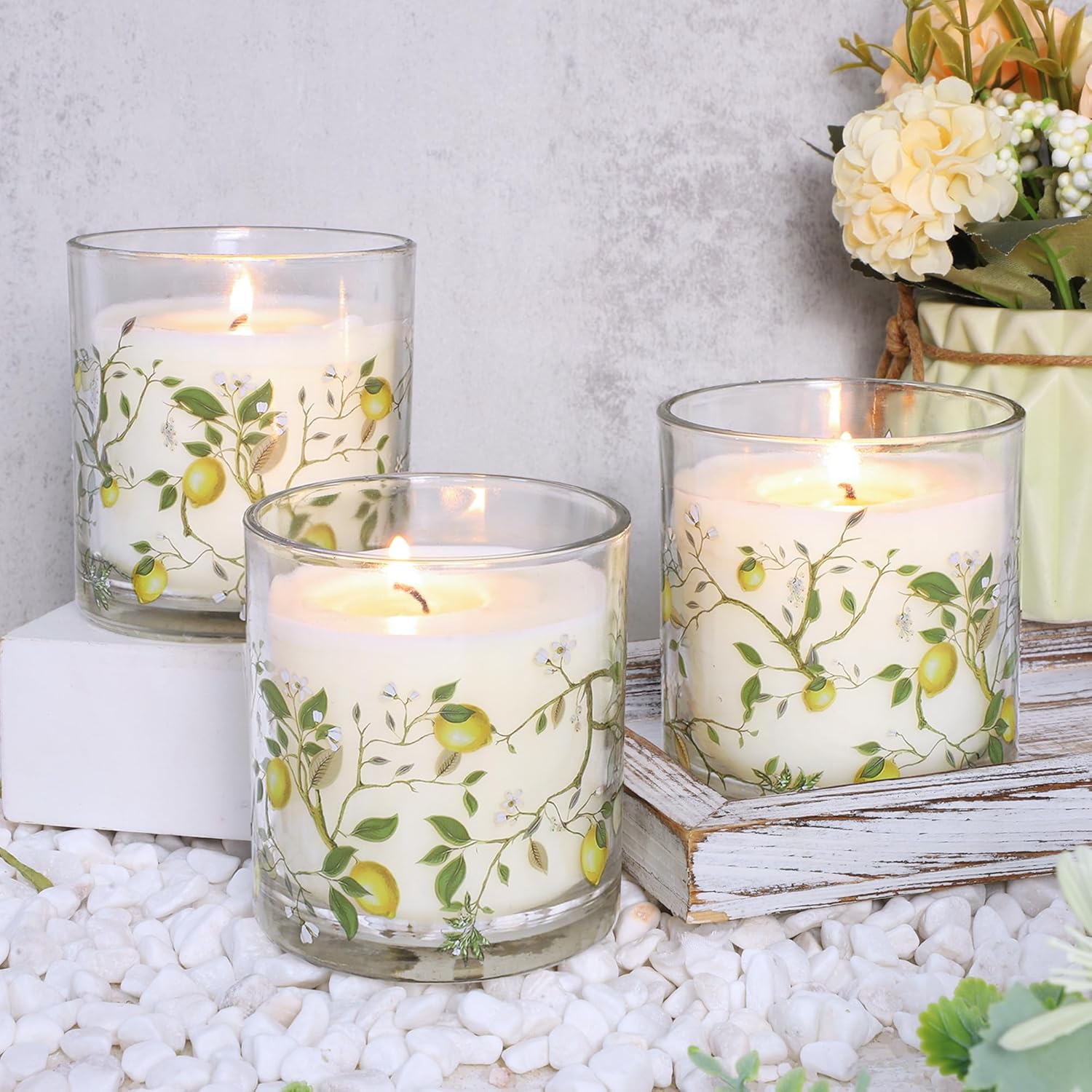 Exquisite Design: Soy wax comes in a high-quality clear glass bottle that not only gives off fragrance, but is also a decorative masterpiece. The exterior is adorned with an elaborate lemon branch decal, with realistic green leaves and bright yellow lemons adding to the charm of nature.
