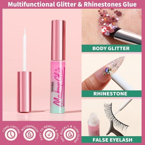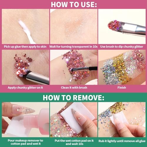 Teenitor Multifunctional Body Glue for Face: Made of premium quality makeup glue, waterproof, no pungent smell and does not irritate skin. Glue is white, quickly turn clear in 10s (just apply a thin layer to avoid wasting), super strong adhesive will make your face gems and body glitter stays well for a long time and not easy to fall off(compare with Self Adhesive face gems, this glue allow stay at least one day even sweat profusely at concert).Easy to remove by warm water, alcohol or makeup remover