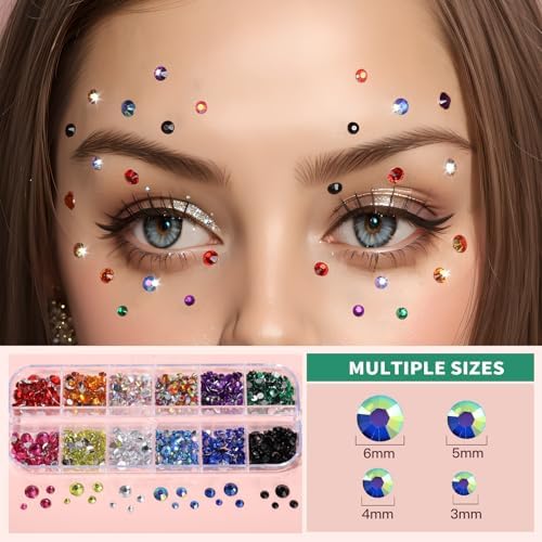 12 Colors of Face Jewels for Makeup: It is unbelievable that you will get 12 colors of nail gems and each color in 4 sizes(3/4/5/6mm) in one box, 3 of them are shining color which can reflect rainbow color, easy to mix different colors to make your personal stylish style. The back of each rhinestones are flat and easy to be glued on face, eye, arm as body art, or your can use them to create nail art decoration or DIY crafts like greeting cards, phone case, shoes, hair clip and so on