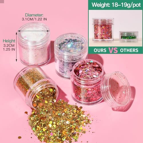 Large Quantity Sparkling Body Glitter: Compare with most body glitter in market, each bottle of ours is filled with chunky glitter and reach 20g(contain bottle), enough quantity for creating large area body art for several times, provide you a super shimmering effect, the most gorgeous holographic sequins you should have in Halloween, Christmas or other festival