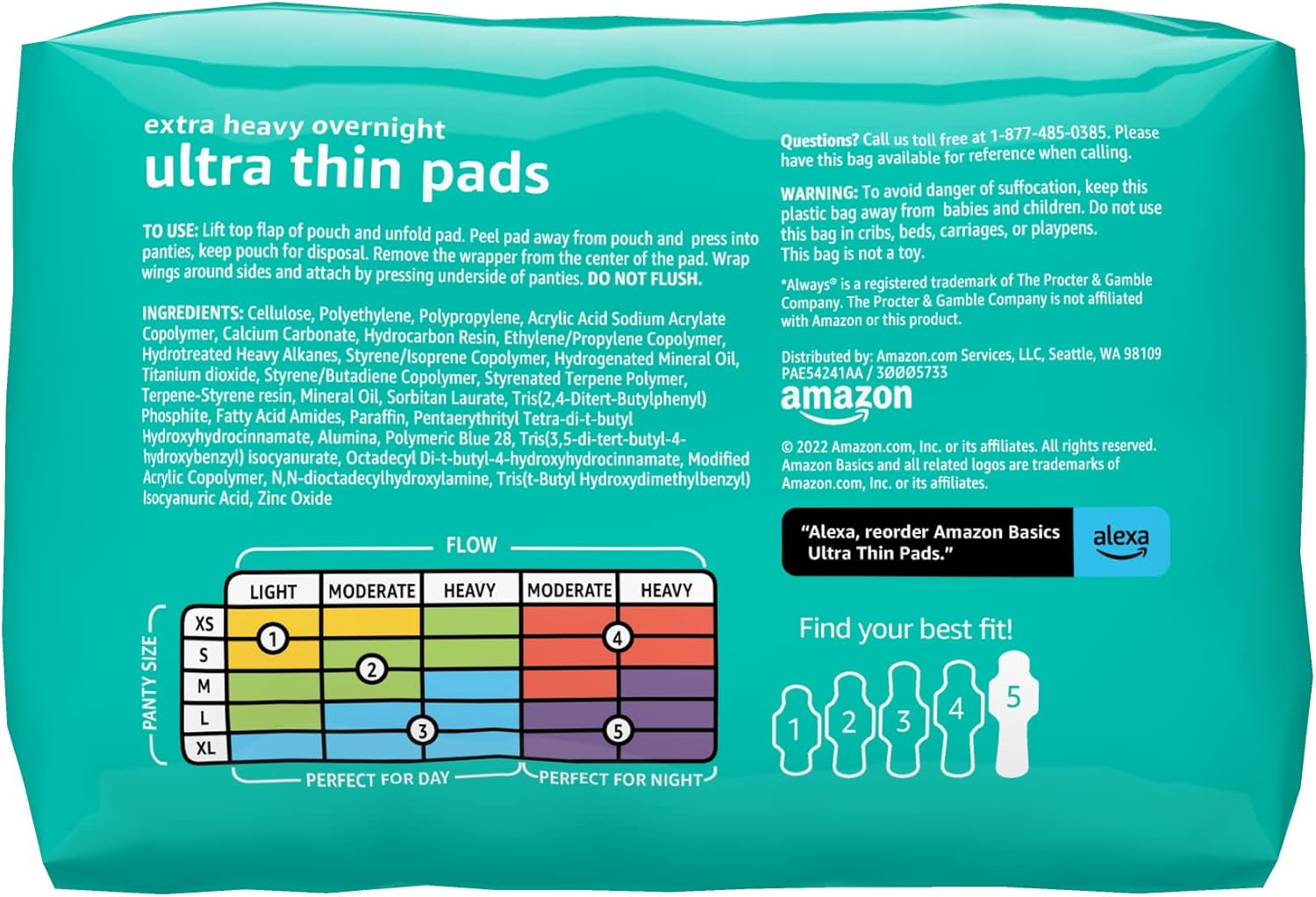 Amazon Basics Ultra Thin Pads with Flexi-Wings, Extra Heavy Overnight Absorbency, Size 5, are designed to provide a new level of skin health and protection through their Dri-Fit technology. The cotton enhanced and breathable outer layers wick away moisture 2x faster to help your skin stay dry and comfortable. The super absorbent core provides up to 10 hours of leakage protection. You can identify your best fit through the sizing chart to help prevent leaks and get the ultimate coverage.