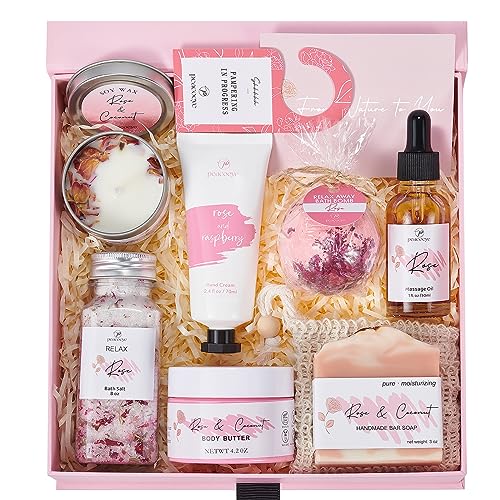 🛀 HANDMADE SPA GIFTS FOR WOMEN – peacoeye Luxury Gift Box includes Rose Scented Soy Candle, Himalayan Bath Salts, Bath Bomb, Handmade Soap Bar, Sisal Soap Bag, Body Buttery, Massage Oil, Rose and Raspberry Hand Cream, Pampering Door Hanger Sign, Greeting Card.