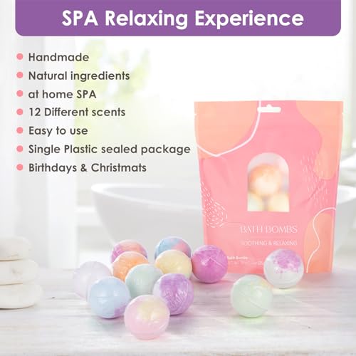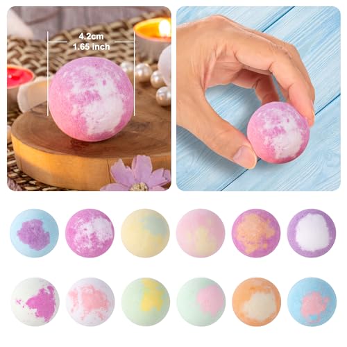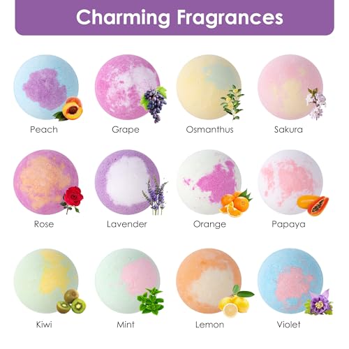 Relaxing Experience: The bath bombs for women contain 12 different natural fragrances. Including mint, lavender, osmanthus, cherry blossom, violet, rose, lemon, orange, kiwi, grape, peach, and papaya.