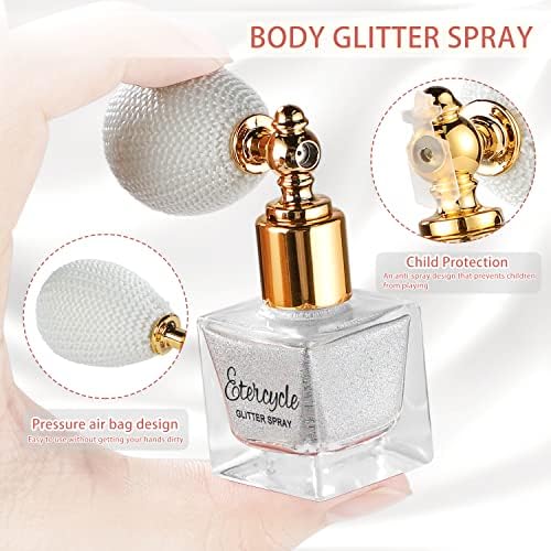 💗 Unique design: Etercycle Body Glitter adopts the retro perfume bottle spray design, the bottle body has delicate nozzle and compressible air bag, you can use it very easily without getting your hands dirty, just aim at the place you want to become shining, gently press the air bag, The shiny highlighter powder will be sprayed on your skin, small and light, easy to carry, let you can shine anytime and anywhere.