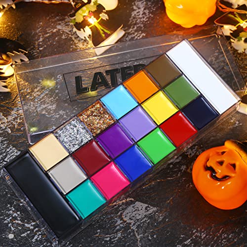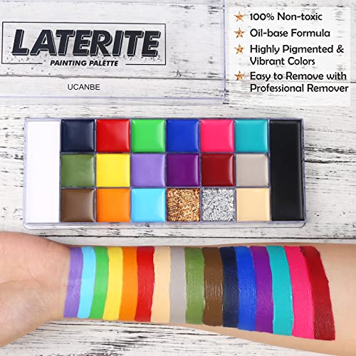 The Laterite Face Body Paint Palette Filled with 20 Colors: Pro palette with 20 solid vibrant colors, include Silver Gold foil Glitter, Bright Purple and Blue, Lemon Yellow , Orange, Blood Red, Green, Dark Blue, Gray, Purple, vibrant colors meet many different occasions. Large pan of Black & White color, full 21g/color, no need to buy an extra clown white/black any more, special color design great for camouflage military woodland outdoor camo face body painting makeup.