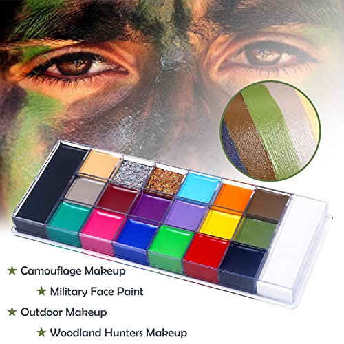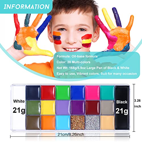 20 Color oil based painting palette – included Large sized Black and White 21g/color, Silver and Gold foil glitter, Bright Purple and Blue, Lemon Yellow , Orange, Blood Red, Green, Dark Blue, Gray, Purple etc.Solid vibrant colors, creamy texture.Large Deep Pan, Filled with 168g, High quality but Affordable.Non Toxic & Hypoallergenic.For cosplayers and parents who need a high quality but affordable face painting makeup pallet for a Party, daily use like army camouflage, Carnivals, Halloween makeup, Cosplay makeup, Stage performance, Christmas party, Festival Celebrations makeup, SFX makeup, Fancy Dress, Fiesta or just for fun.This Special Colorful Face Paint Palette is a great gift for all ages! You don’t have to be an artist or pro face painter to give your children hours of creative fun with our face painting kits.