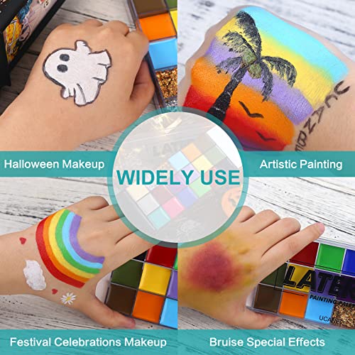 Great Color Payoff Face Body Painting Palette: Oil-based formula creamy paste bold and highly pigmented! Made of high quality ingredients to be easy blended, fully loaded, applies easily with sponge or brush. Provide fully skin coverage, works exceptionally well for all aspects of face and body painting such as contour line work, base work, blending and layering.