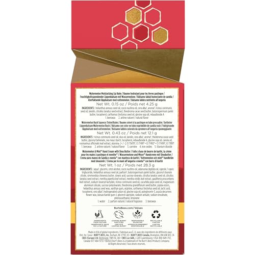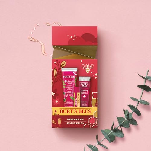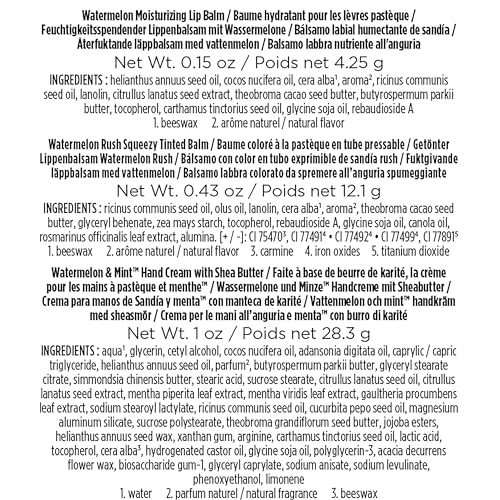 PACKAGE CONTENTS: One package of Burt’s Bees Merry Melon contains one Watermelon and Mint hand cream, one Watermelon lip balm and one Watermelon Rush Squeezy in holiday-themed packaging