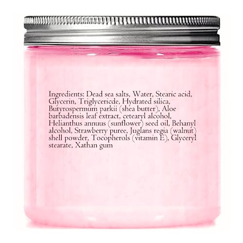 AMPLIFY YOUR SKIN EXFOLIATION with the Strawberry Ice Cream Body Scrub, featuring ultra-fine dead sea salt granules. These are meticulously calibrated for delicately assisting in the minimization of uneven skin texture and pore congestion, unveiling a softer, smoother skin.