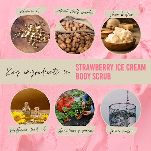 ACCENTUATE YOUR SPA DAY, pre-shaving ritual, foot care, or pre-tanning preparation with our Strawberry Ice Cream Body Scrub, exhibiting a delicate fusion of strawberry puree, shea butter, and coconut oil, for an aromatic journey to a tropical haven.