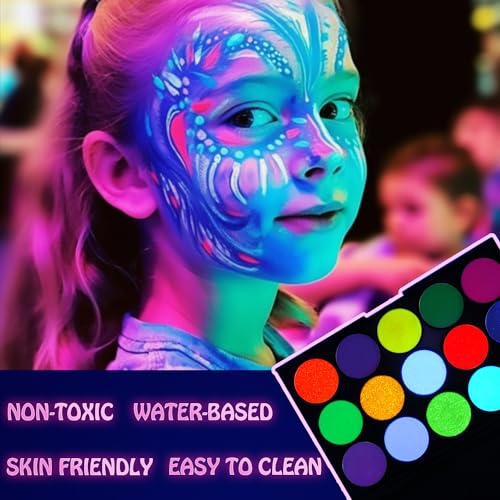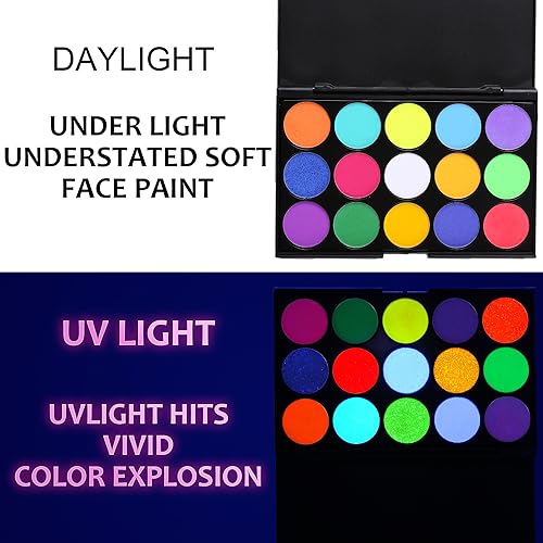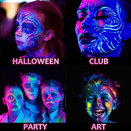 Vibrant Glow: Experience a bright, vibrant glow under UV light. Our face paint comes alive in the dark, making your designs truly pop. It’s perfect for parties, festivals, or any event where you want to stand out.