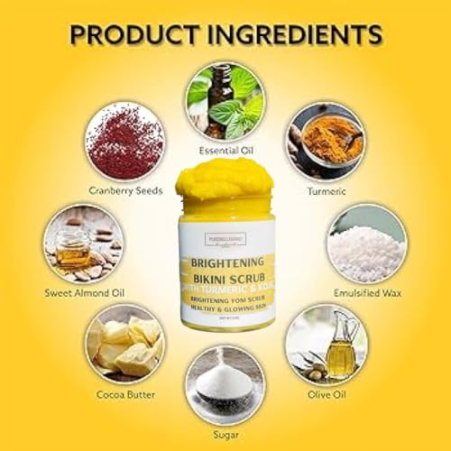 Fade Away Dark Spots: Do you want to get rid of razor bumps in the bikini area? Our Brightening Bikini Scrub is infused with powerful ingredients such as turmeric and kojic acid, known for their skin brightening properties, to help effectively reduce the appearance of dark spots on your bikini area.