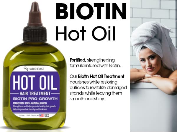 BIOTIN HOT OIL TREATMENT – Hair Chemist Hot Oil Treatment is a fortified strengthening formula infused with Biotin, a water soluble vitamin that’s part of the vitamin B family that helps stimulate healthy hair growth for thicker, fuller hair.