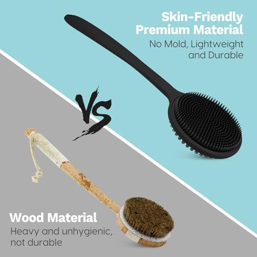 【Multiple Uses】A silicone shower brush gently exfoliates pores, removes dirt and body oil, and helps soften, glowing skin. Use it to cleanse your entire body! Extended handle, you can reach anywhere you want to reach.