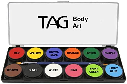 TAG Regular Palette comes with 12 regular colors: Yellow, Pink, Light Green, Dark Green, Brown, Black, White, Orange, Red, Light Blue, Dark Blue and Purple. in 10gram containers, along with 2 face paint brushes.