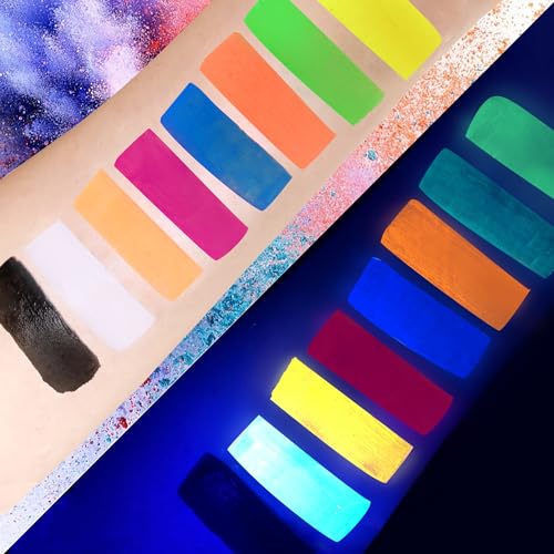 Suitable for both day and night use. Bright, neon coloured under normal lighting, the paints give off an immense fluorescent glow under UV Lighting / Blacklights.
