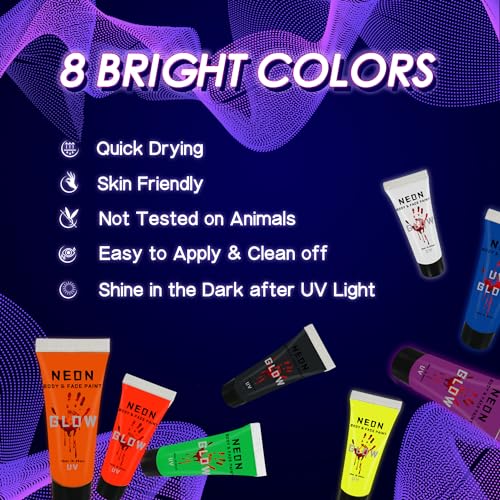This face painting comes with 8 Tubes UV vivid colors. Create for any type of artistic makeup or special effects coloring.