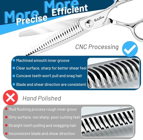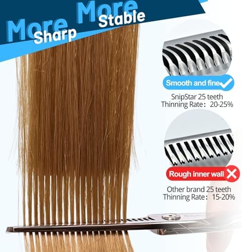 ✂️【SnipStar Solves Inaccuracy and Unsharpness Problem】Compared with hand polished texture scissors, professional hair thinning scissors are processed with CNC technology, the inner grooves of the blades are smooth and clean, which makes the blades sharper and more precise; one of the thinning shears blades is smooth and mirrored, and the other is curved teeth, which won’t hook and pull the hair and reduce split ends compared to straight teeth; the thinning rate is 20-25%, which will make your thick hair thinner, and look stylish and layered.