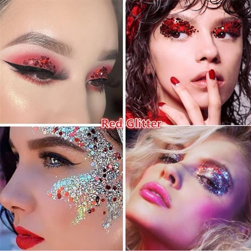 Red Body Glitter Face Paint Holographic Effect:This chunky glitter blends with plenty of different shapes and sizes of chunky and fine glitters in a gel base,great for a metallic coverage wtih a holographic effect.The mermaid sequin glitters have vibrant color,which shows up as an ultra-reflective and shiny sparking shimmer smear.