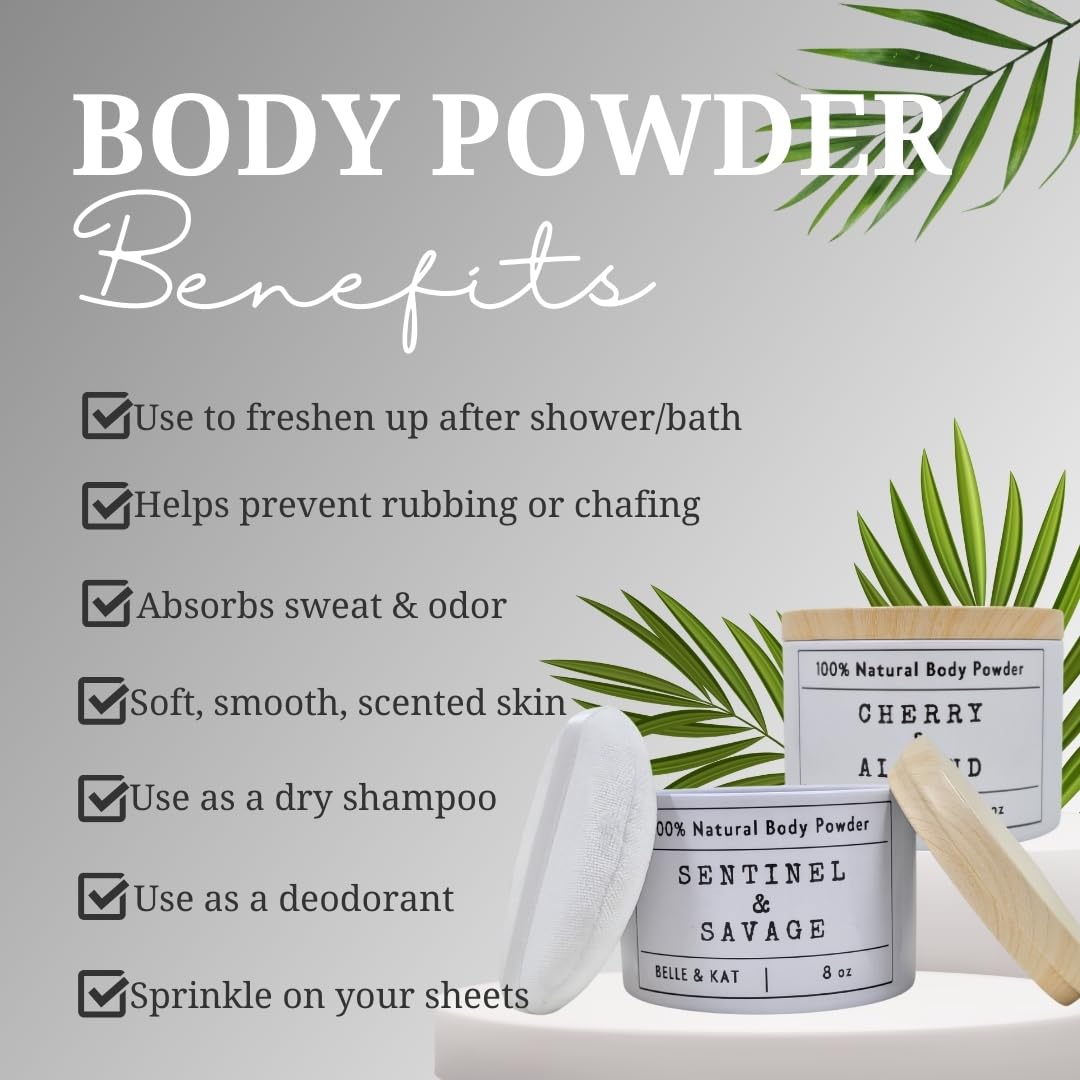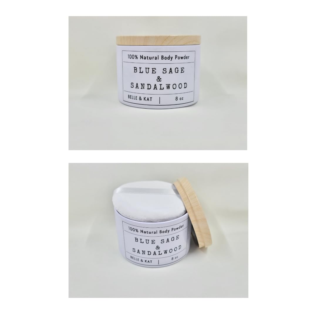 The body dusting powder is Blue Sage & Sandalwood scented and is designed to leave your skin feeling soft, smooth and beautifully scented. This gentle powder is perfect for pampering yourself after a shower or bath. Use the included soft powder puff (or hands, or any other applicator of choice) to apply powder for silky soft skin. It provides long-lasting freshness and absorbs excess moisture.