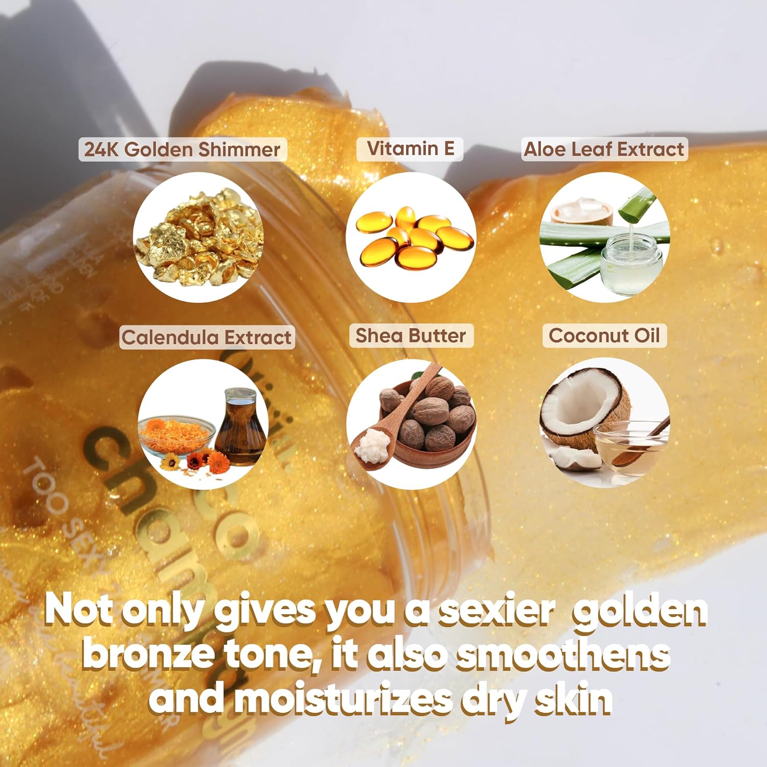NATURAL INGREDIENTS AND ORGANIC EXTRACTS – Our formula has been tested to penetrate deeply into your skin to hydrate and increase the brightness thanks to our 100% natural extracts like 24K Golden Shimmering Glitter, Shea Butter, Cocoa Butter, Calendula Extract, Almond Extract, Aloe Vera Extract, Vitamin E