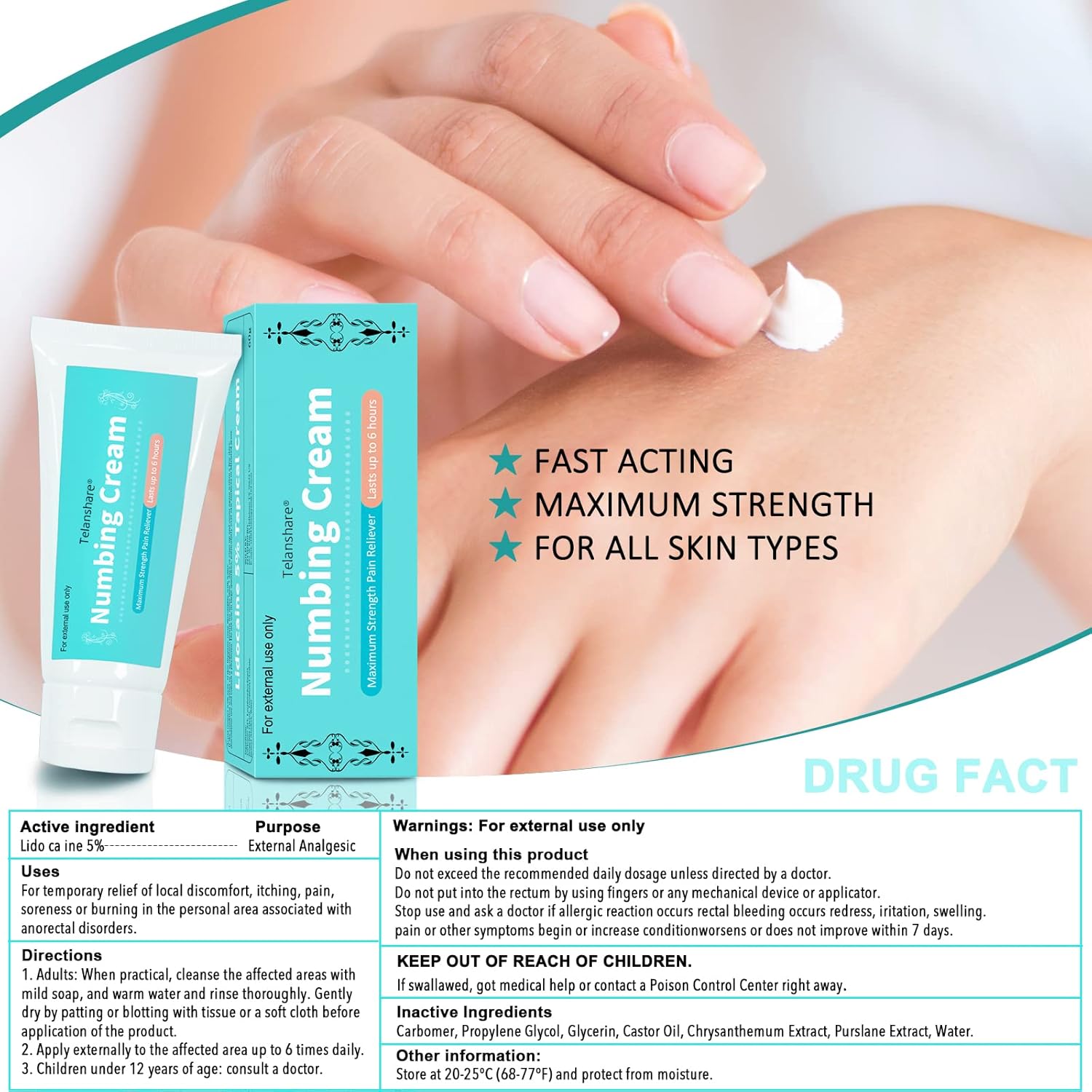 Numbing Cream for Tattoos: Contains 5% of the highest strength reliever for numbness for up to 4-6 hours. It can be used for tattoos, piercing, micro-needling, minor cuts, scrapes, Brazilian waxing, eyebrows, insect bites, minor burns, sunburn, muscle soreness and other pain blocking relief.