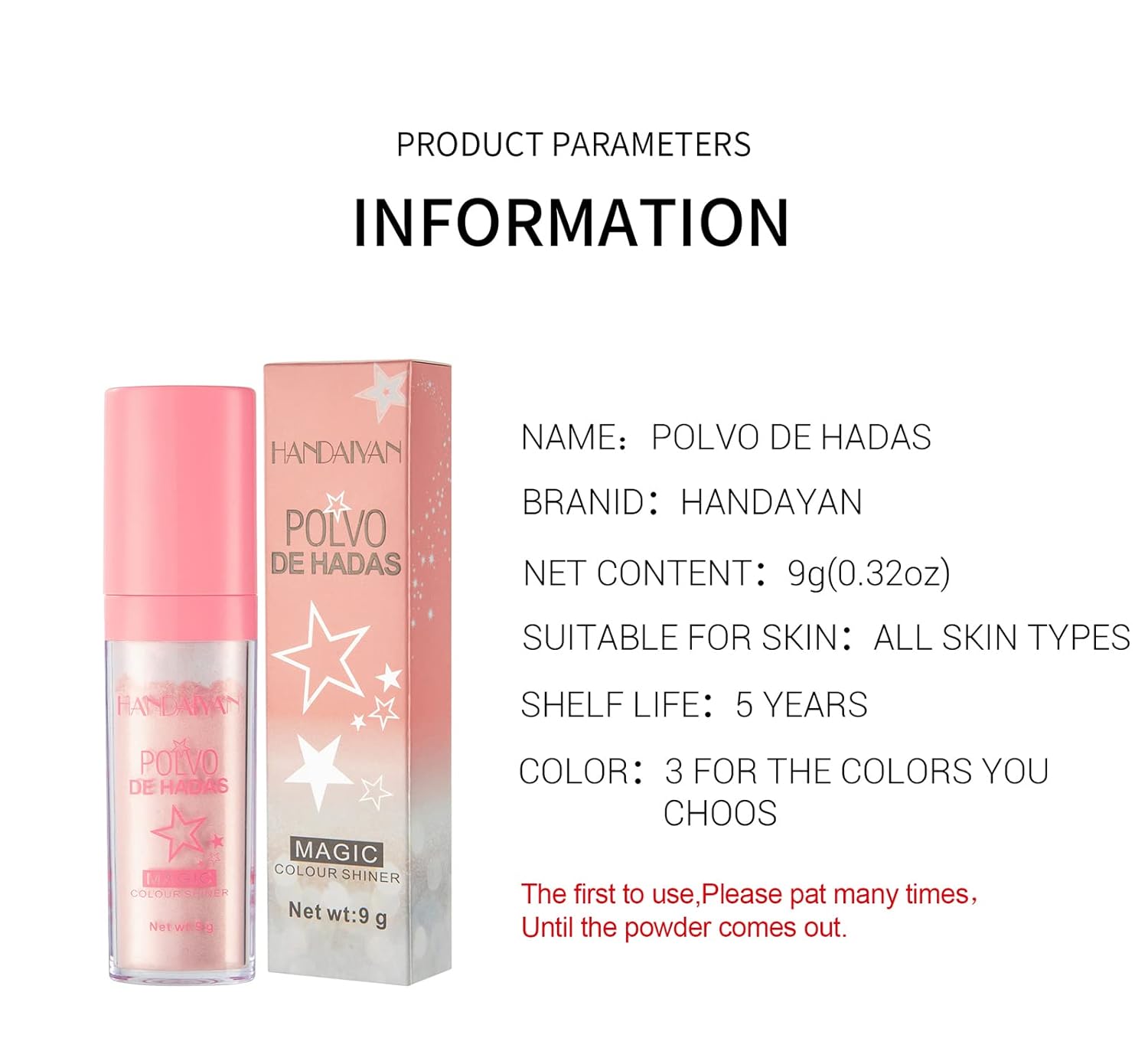 【Perfect Gift】Micro-pearl, the Polvo De Hadas, fairy highlighter blush powder brightens the contour, non-greasy, refreshing texture that helps to cover excess oil, and is not easy to clog skin pores. Easy to spread, easy to apply, easy to apply makeup. For those around you who like highlighter makeup! It is easy to carry, has natural luminescence, suitable for various occasions. Ideal gift for yourself or your friends, girlfriend, or wife as a birthday, Hallowmas, Christmas, or holiday gift.