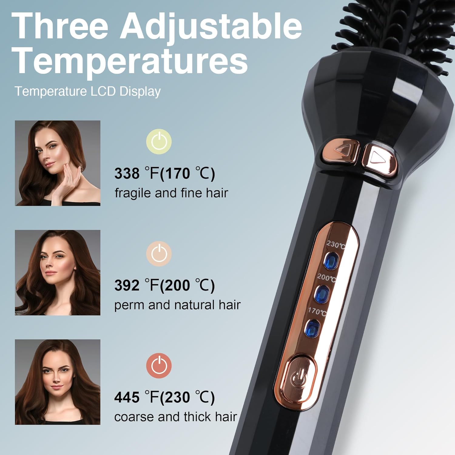 Choose the appropriate temperature setting:338℉ for natural hair; 446℉ for sofa or frizzy hair.The hair texture will affect the curling results. Curling brush is not suitable for very thin, soft, and thick, coarse hair. It is recommended for individuals with chest length hair to use the product for a longer duration for better results. Not suitable for people with short or extra long hair.For sofa or frizzy hair, hold the curl for 4-5 seconds, while for natural hair, hold it for 3 seconds.After curling, use a styling hairspray to maintain the curling effect.