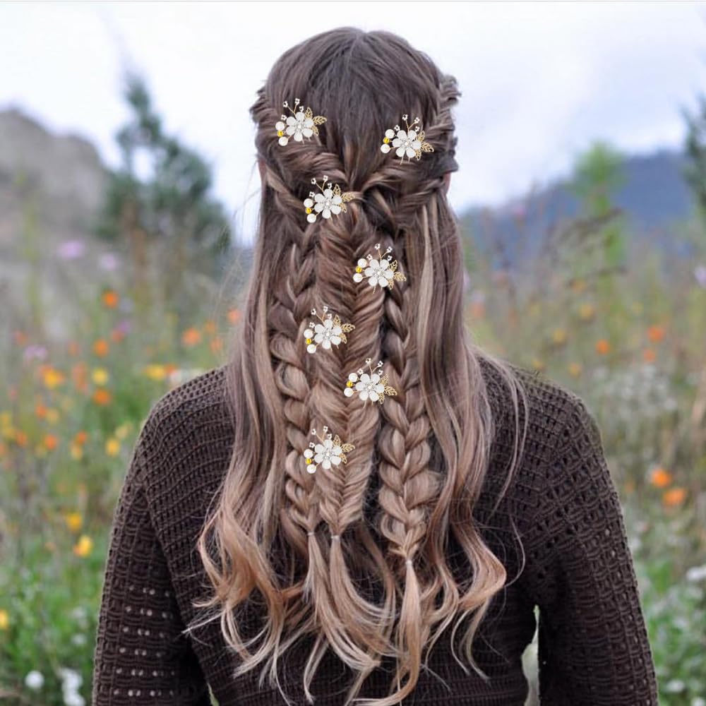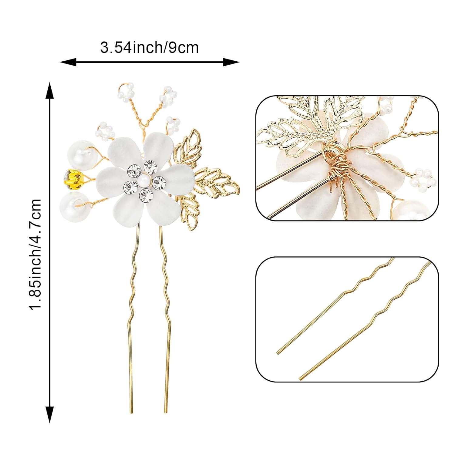 8 PACK Bridal Flower Wedding Hair Pins, Gold Leaf Bride Headpiece, Crystal Pearl Wedding Hair Styling Pins, Hair Accessories for Brides Bridesmaids Women Girls Updo (White)