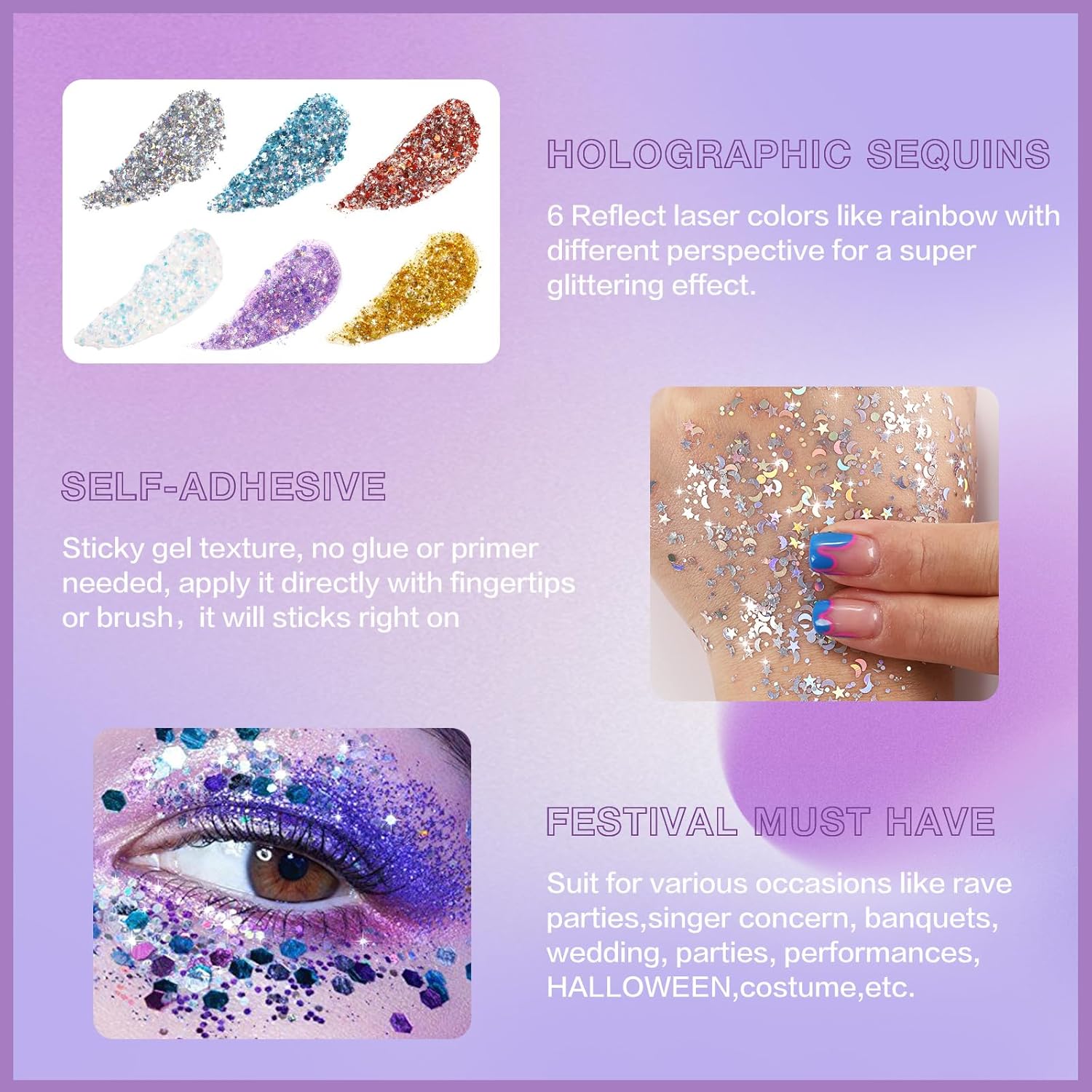 ✨Face & Body Glitters – Cosmetic luminous body glitters with numbers of high shine sequins like stars ,moon and hexagon, reflect the shine of laser colors like rainbow with different perspective. Make you shine at any parties and occasions.