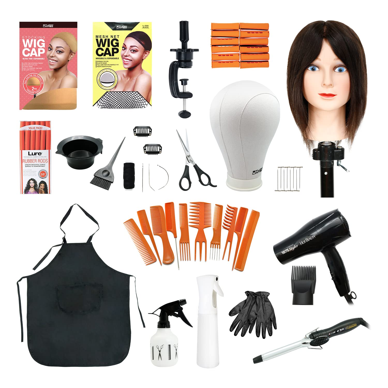 Studio Limited Cosmetology Kit 20pcs, Poly Urethane (PU) Canvas Block Mannequin Head Set (23″)