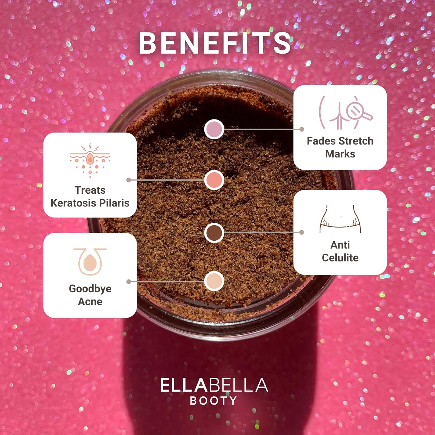 CELLULITE & STRETCH MARKS NO MORE – Provitamin B5 and Vitamin E hydrate and rejuvenate the skin making it appear smoother and younger. High in antioxidants, EllaBella’s Ms. Booty Scrub can help reduce the appearance of cellulite on your legs and butt.