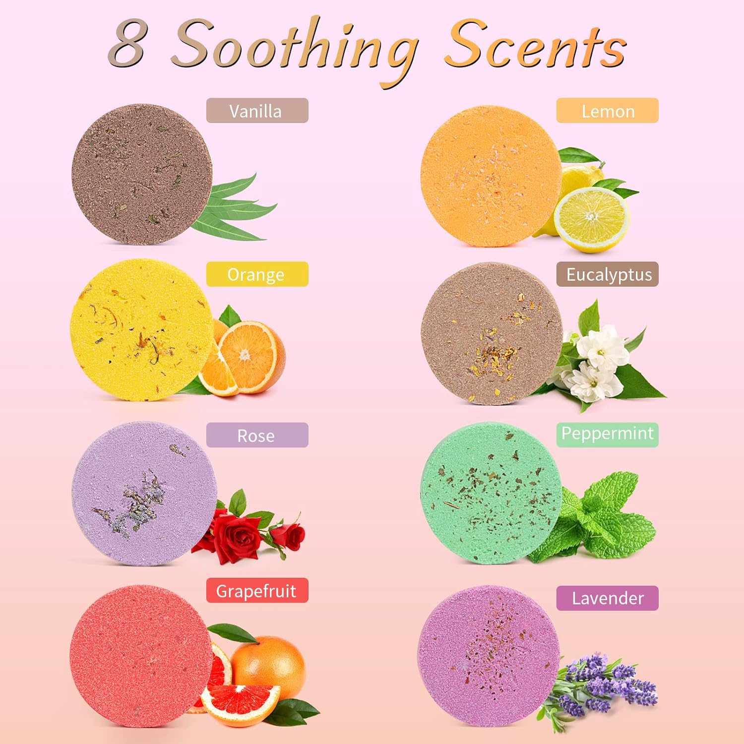 Compared to most shower bomb sets that come with just 6PCS shower steamers, ours include 8PCS allowing you to enjoy them for weeks till your next purchase. Delight in the mind-soothing scents of Lavender, Rose, Vanilla, Eucalyptus, Peppermint, Grapefruit, Orange, Lemon; Enjoy our shower steamers with pure and natural ingredients to create a wonderful aromatherapy shower experience.