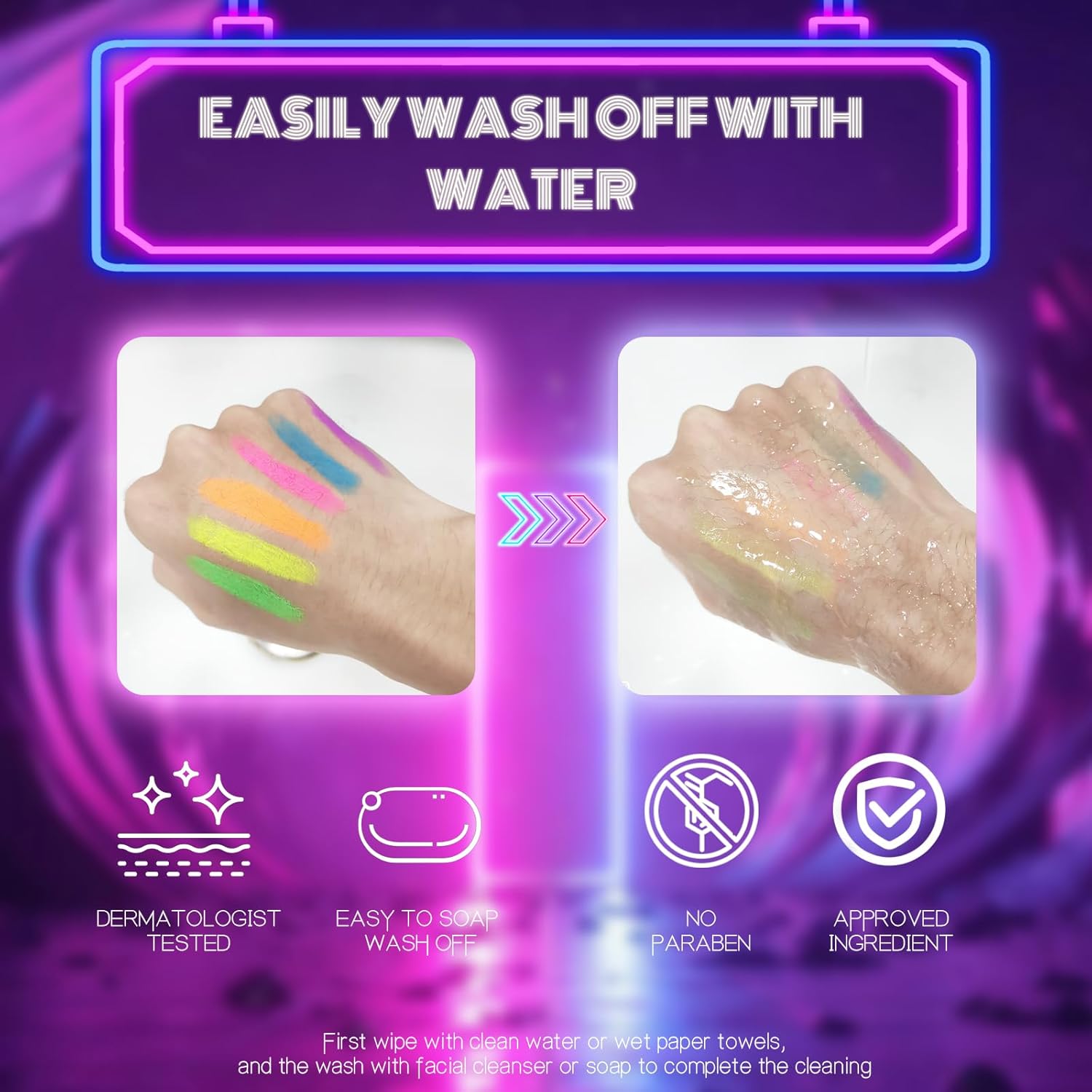 🌈【Easy to Use and Wash】The glow face paint for kids and adults are Easy to Apply and wash off,just use regular makeup remover wipes to wipe the skin, which can save you time and energy.