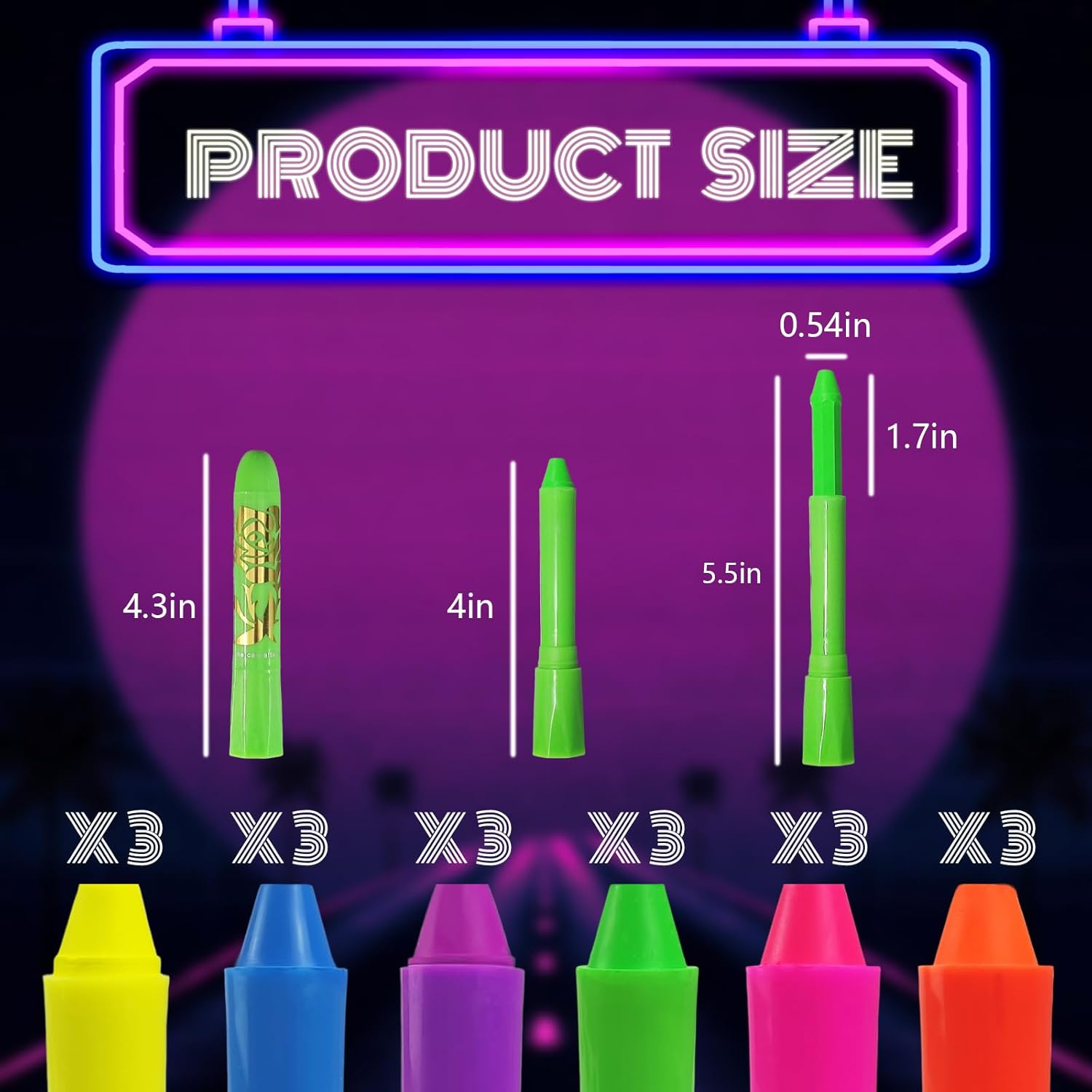 🌈【Neon Face Paint】Our blacklight makeup face painting kits includes 6 vibrantly colored assortments of face painting sticks,blue, pink,purple, yellow, orange,green.