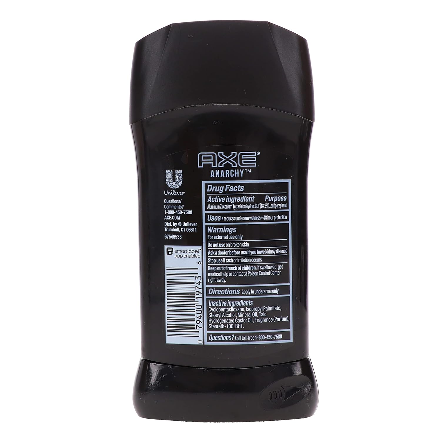 AXE Anarchy Premium Antiperspirant Deodorant Stick gives you 48 hours of dryness with a bold dark pomegranate & sandalwood fragrance. Stay dry, fresh and confident for 48 hours, whatever comes your way. Premium antiperspirant stick delivers anti-sweat protection with every swipe. Goes on invisible for no white marks or yellow stains. It’ll keep you dry, in control and smelling fresh. All. Day. Long. Same exhilarating AXE Anarchy scent fragrance, fresh new look.