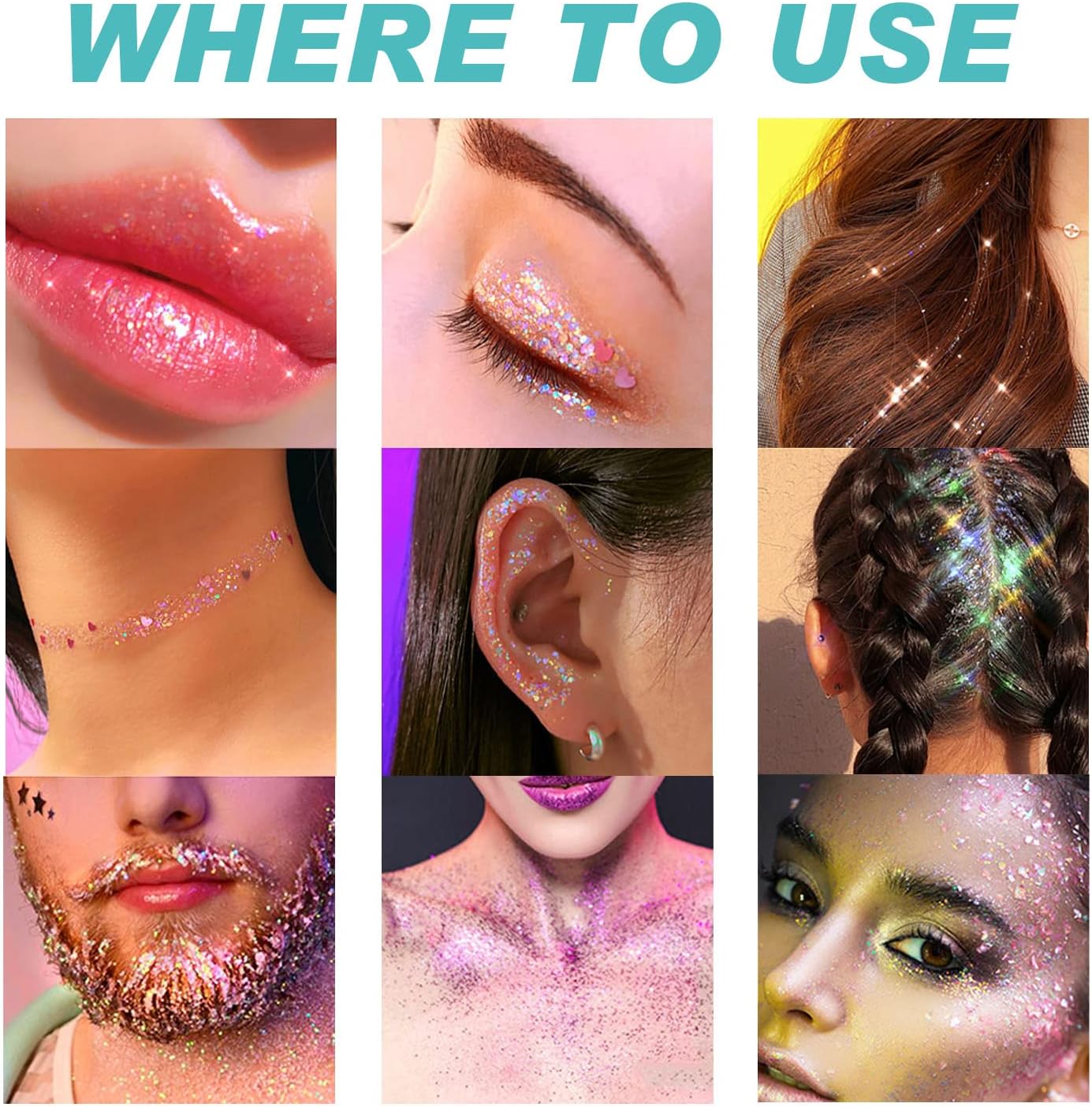 【Multi-usages】This glitter gel is perfect for your body, head to toe: face, eyeshadow, cheeks, lips, and hair! Be wild and prepare for festivals, clubs, parties, raves, costumes, themed parties, the company’s year-end party, or a Christmas party with your friends.