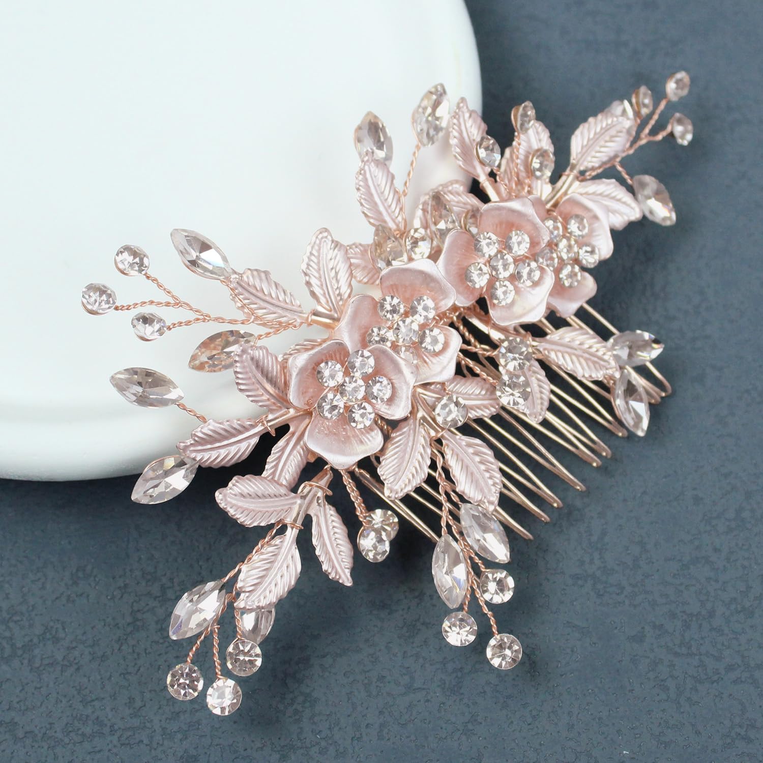PTORIZNY Wedding Rhinestone Hair Comb Crystal Bride Hair Combs Flower Side Hair Combs Leaf Headpiece Bridal Hair Accessories for Women and Girls (Rose gold)
