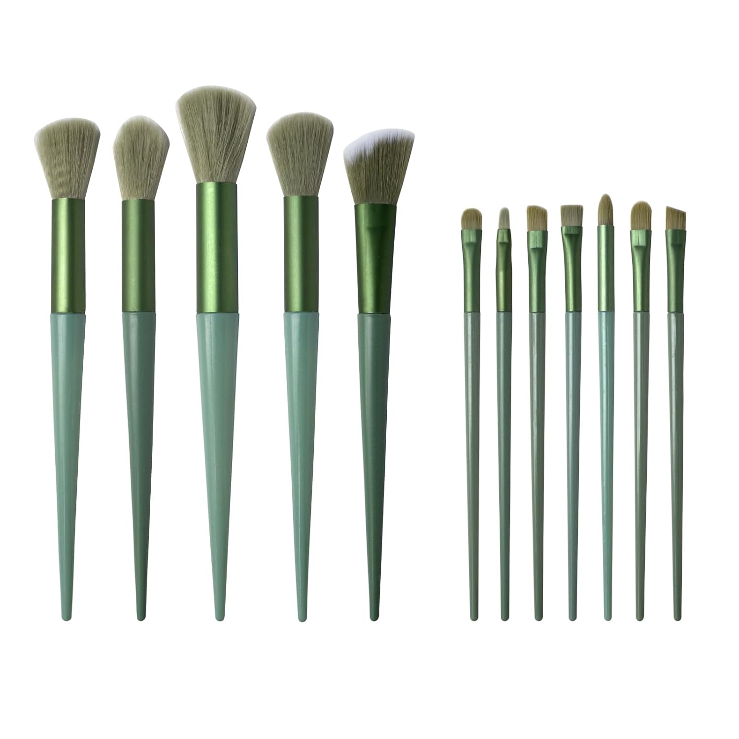 Package included:13 Pcs brushes in total.Powder brush, foundation brush, contour brush, round brush,Highlight brush, concealer brush, eyeshadow brush, smoky brush,Smudge brush, eyebrow brush, detail brush, angled eyeshadow brush, and lip brush.(5 pcs big face kabuki makeup brushes and 8 Pcs precision brushes.)