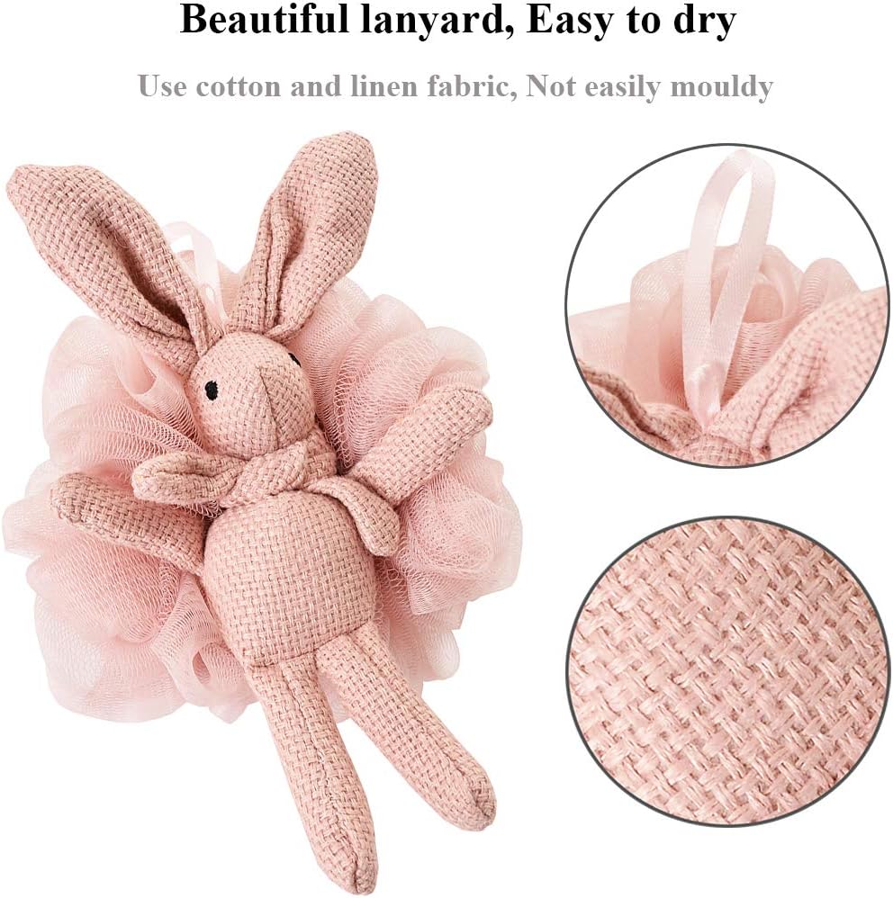 Material Specifications: Kids bath sponge is made of PE and fabric materials, combined with Pouf mesh and cute rabbit, the reliable and stable quality make them comfortable to use for a long time