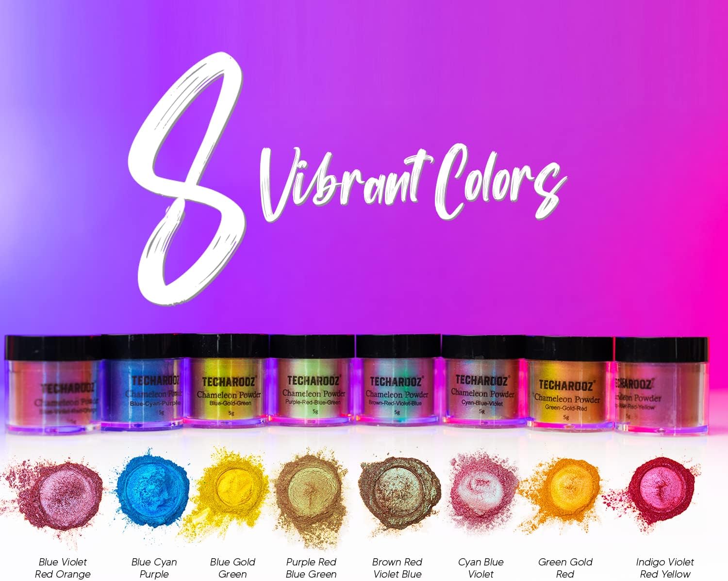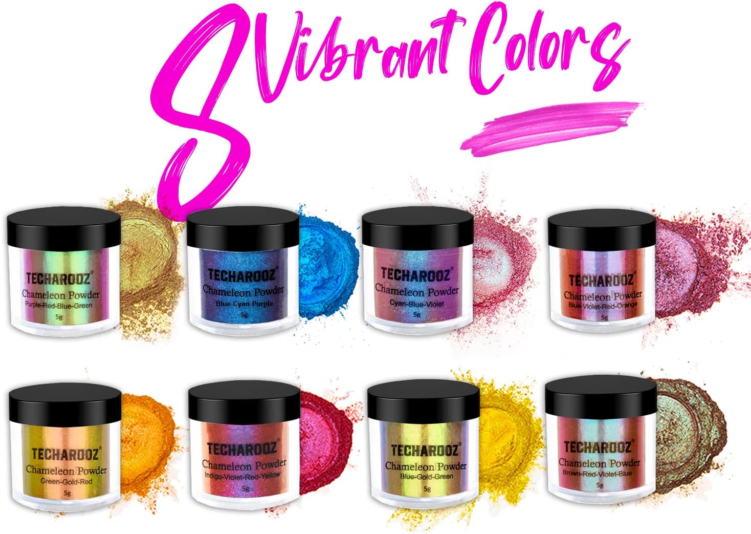 💝 💝 【Variety Pack】: 8 – Color Chameleon Mica Powder: TECHAROOZ Color Shift Mica Powder offers a different Look/color when viewed at different angles. Each jar contains 5g/0.18oz covering hues of Blues, Violets, Purples, Cyans, Greens, Golds, Brown, Red, Yellows & Oranges. Brush them onto your Resin Mold or mix them in your Resin for breathtaking Resin Art