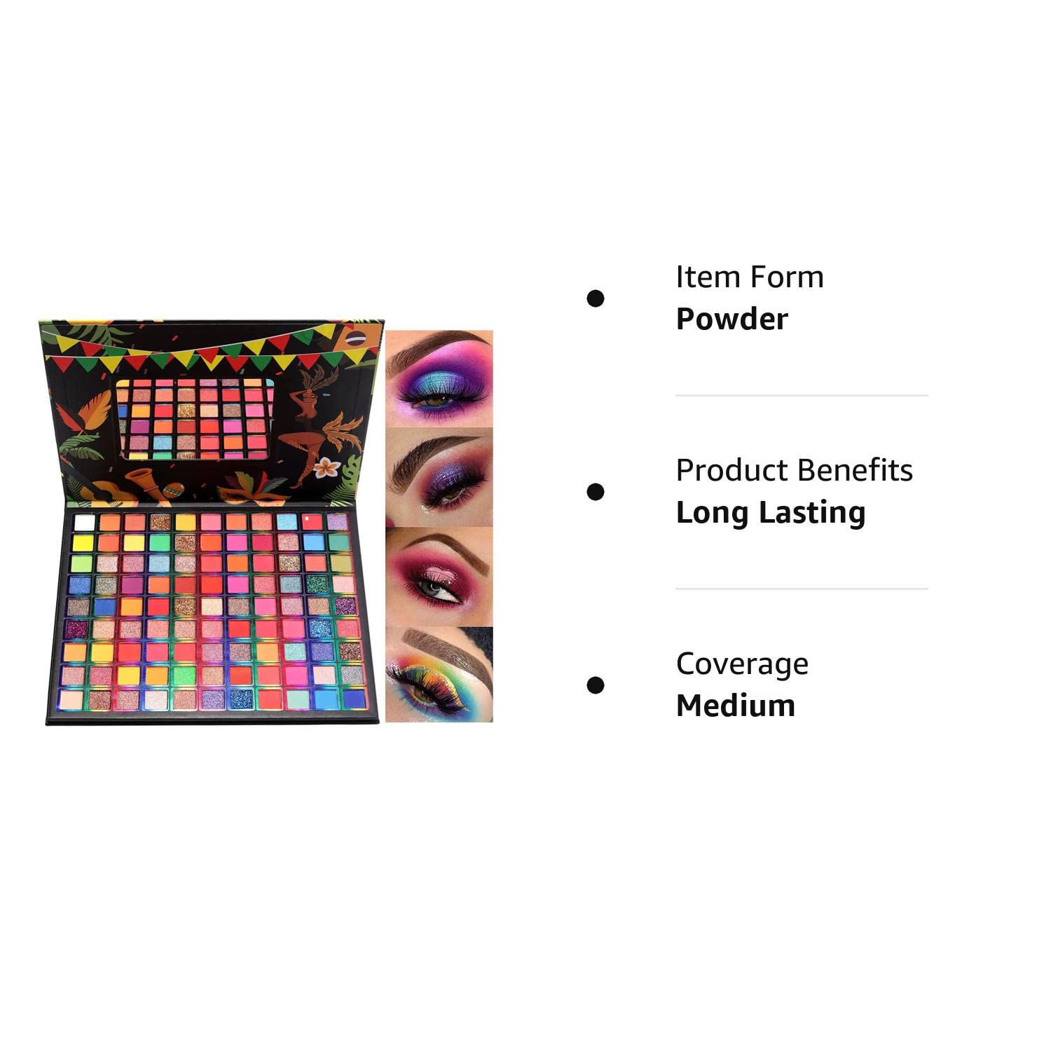 【99 Colors Makeup Palette】A magically iridescent eyeshadow palette contains professional cool and warm-toned pigments and shades. With different textures: soft smooth mattes, shimmery pressed pearl and dazzling metallic glitters. This richly toned palette features versatile shades that can be blended and layered to create endless amounts of looks.