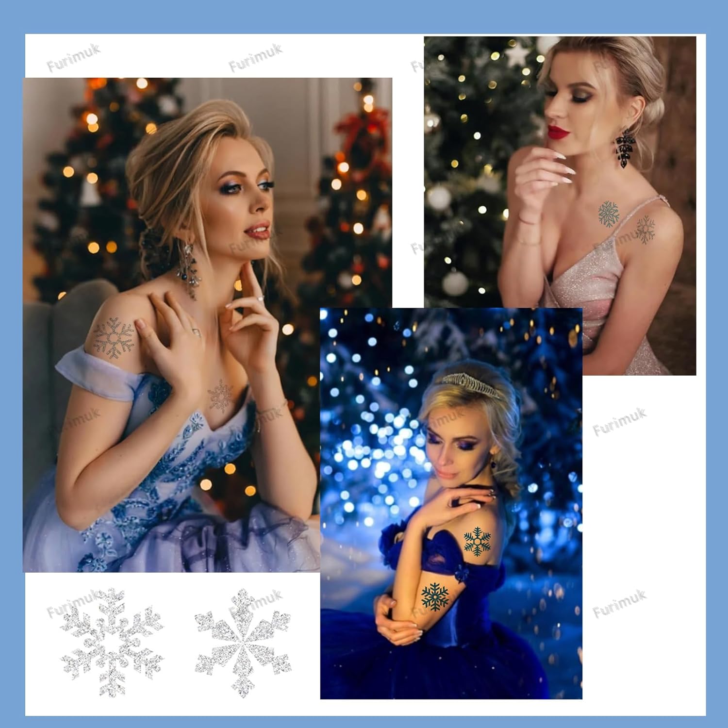 Unique Color Combination: There are 4 colors of our Furimuk snowflake tattoos, Glitter Dark blue, Glitter light blue, Glitter ice silver, and Glitter white silver, which are the colors of winter. Shining in the sunshine.