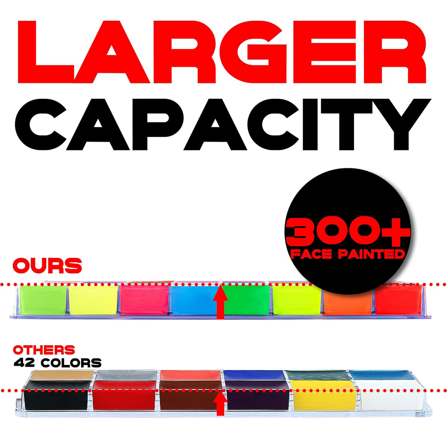 Practical 36-colors 22 vibrant colors, 8 pearlescent colors, 6 fluorescent colors.Waterproof Oil-Based face paint has fantastic pigmentation / coverage,does not crack.Specially formulated to be non-toxic, paraben-free, and fragrance-free for all skin types.