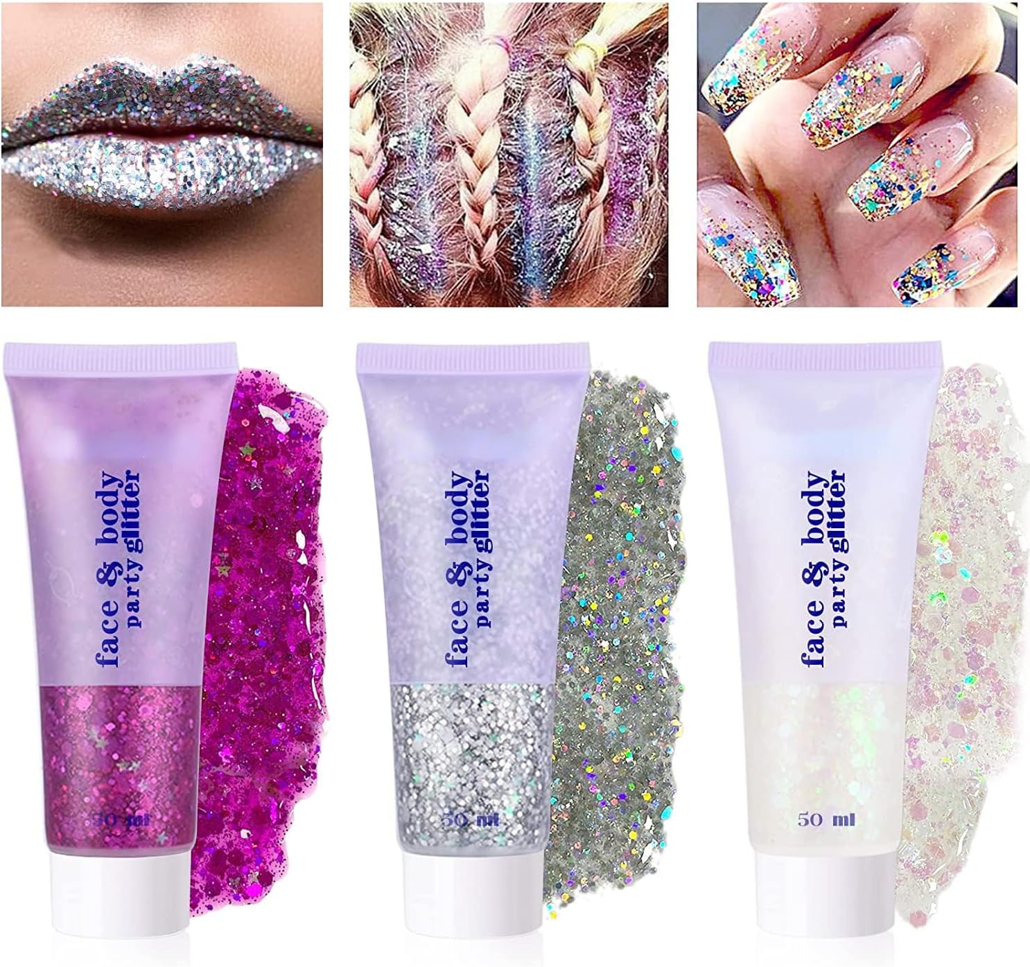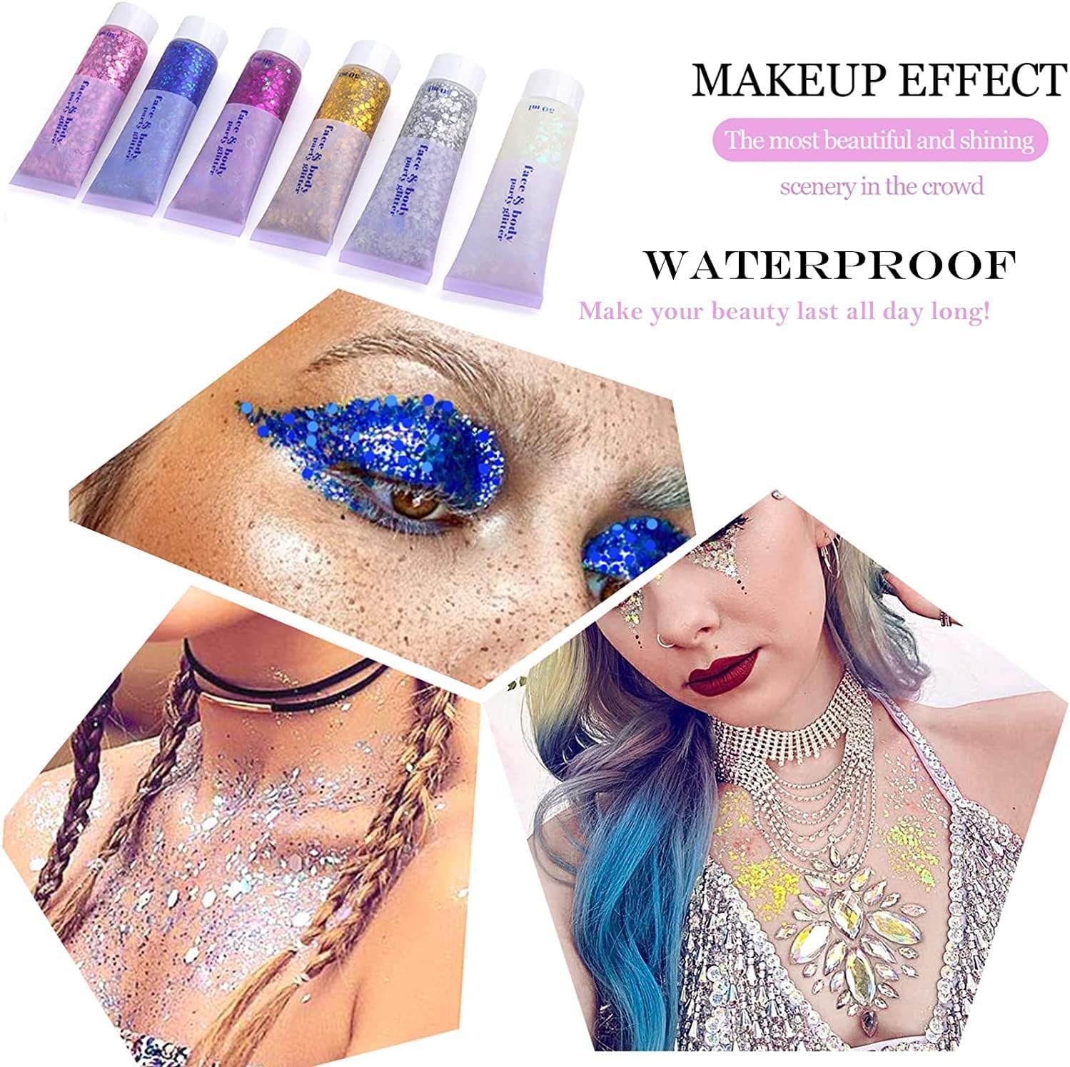 Glitter makeup is the perfect addition to your body and makeup routine. Perfectly for festivals, clubs, parties, raves, costumes face and body glitter gel.
