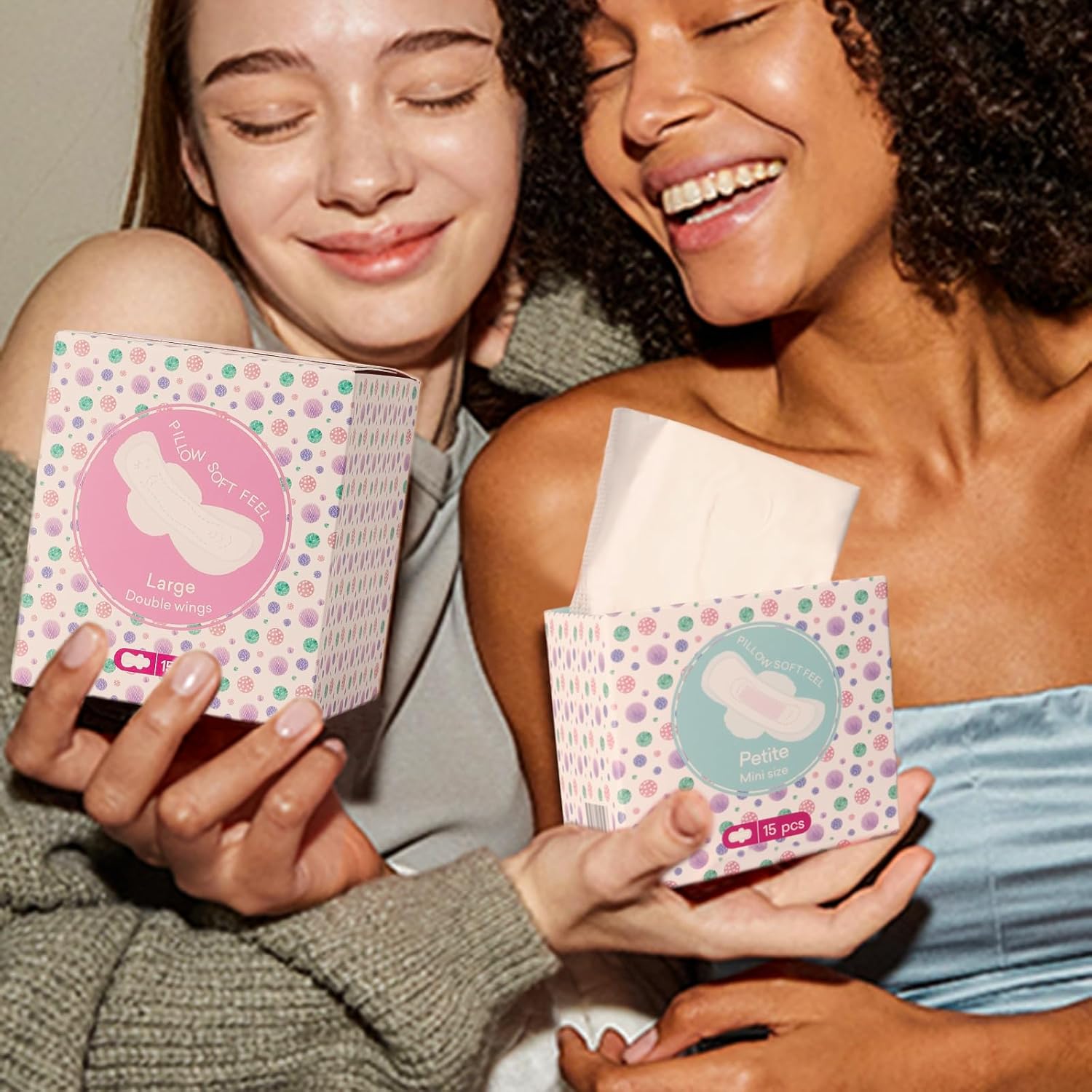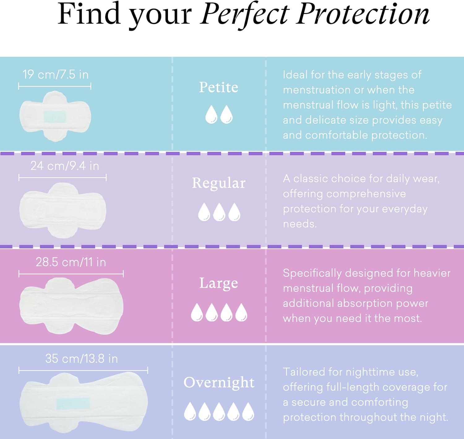 Size Variety Galore: Purcomfy presents a diverse range of options! Alongside the 9.45-inch regular Size, we also offer the 7.5-inch petite mini size, the 11.22-inch super absorbent large size pads, and the grand 13.78-inch overnight size pads—essential tween pads and school must-haves for teen girls—catering to different needs. Whether it’s day or night, whether you’re active, studying, going out, or sleeping like a queen, our sanitary pads provide you with the best support.
