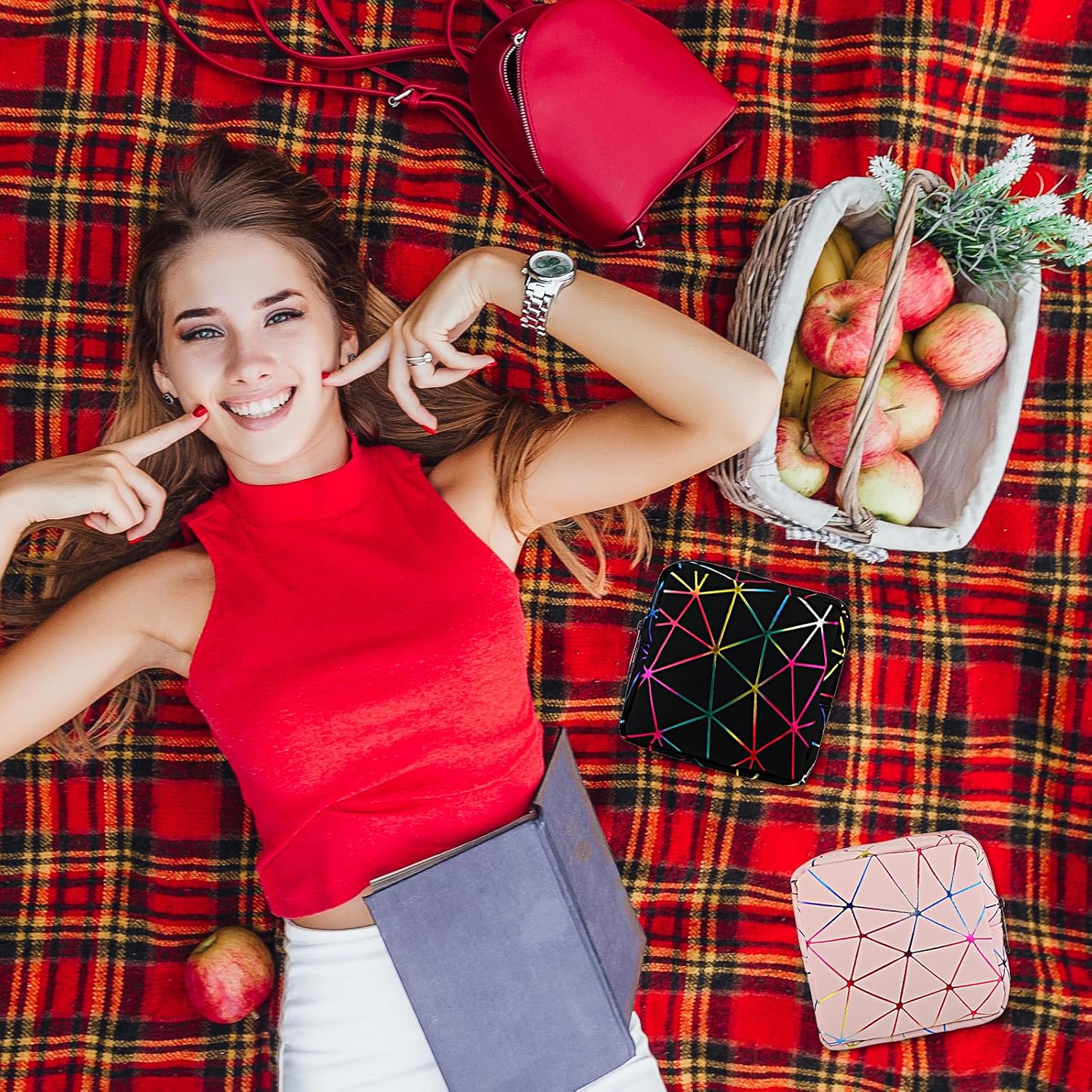 【Thoughtful Designs】The size of the pu leather period pads bag (black/pink) is 5.1*5.1*1.6 inch, it can hold 8-10 pieces of normal size sanitary napkins. The compartment design inside the menstrual pad bag is easy to store tampons and Keep them clean and orderly. It can be easily put in your purse backpack or handbag in school Protecting your privacy.