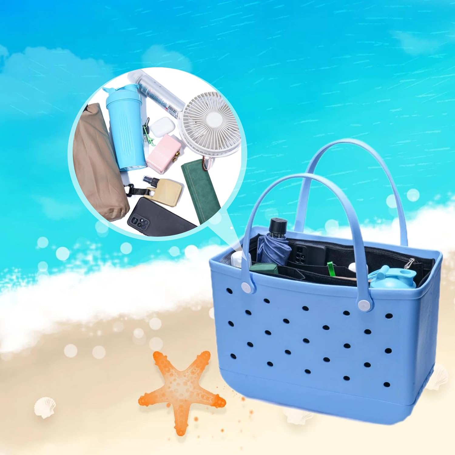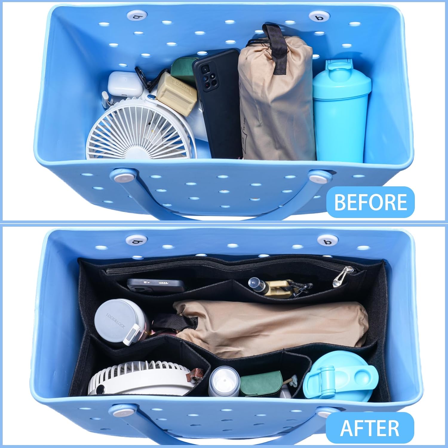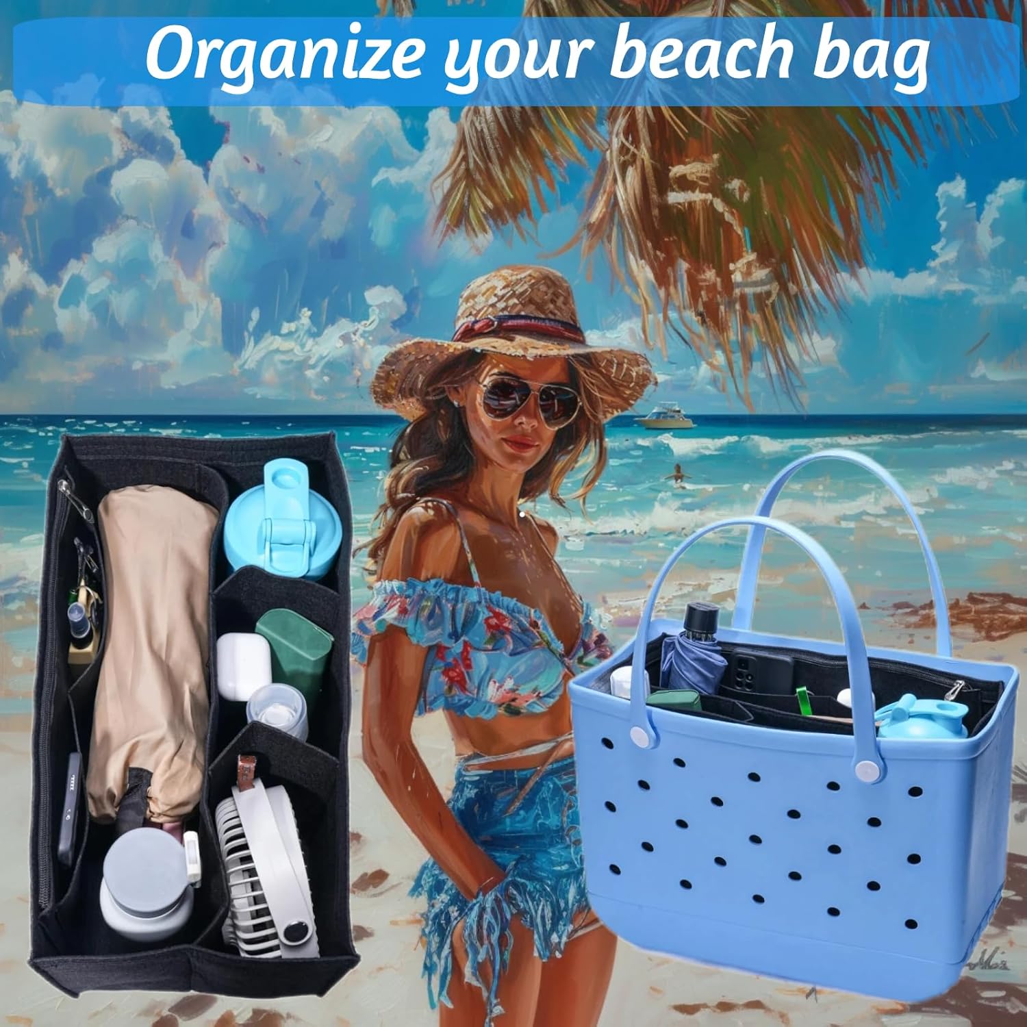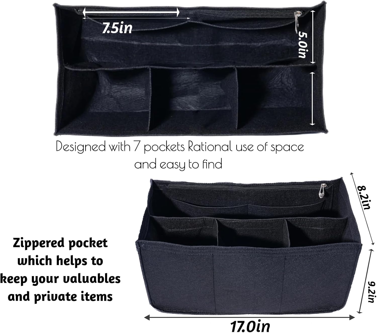 Beach bag insert size: Medium organizer: Large organizer: 17.5×7×9.5 inches (length× width× height). Fits large Borg bag, the bottom of the bag is 16.5 inches long, 7.87 inches wide and 12.8 inches high. Please check the size carefully and compare the purchase.