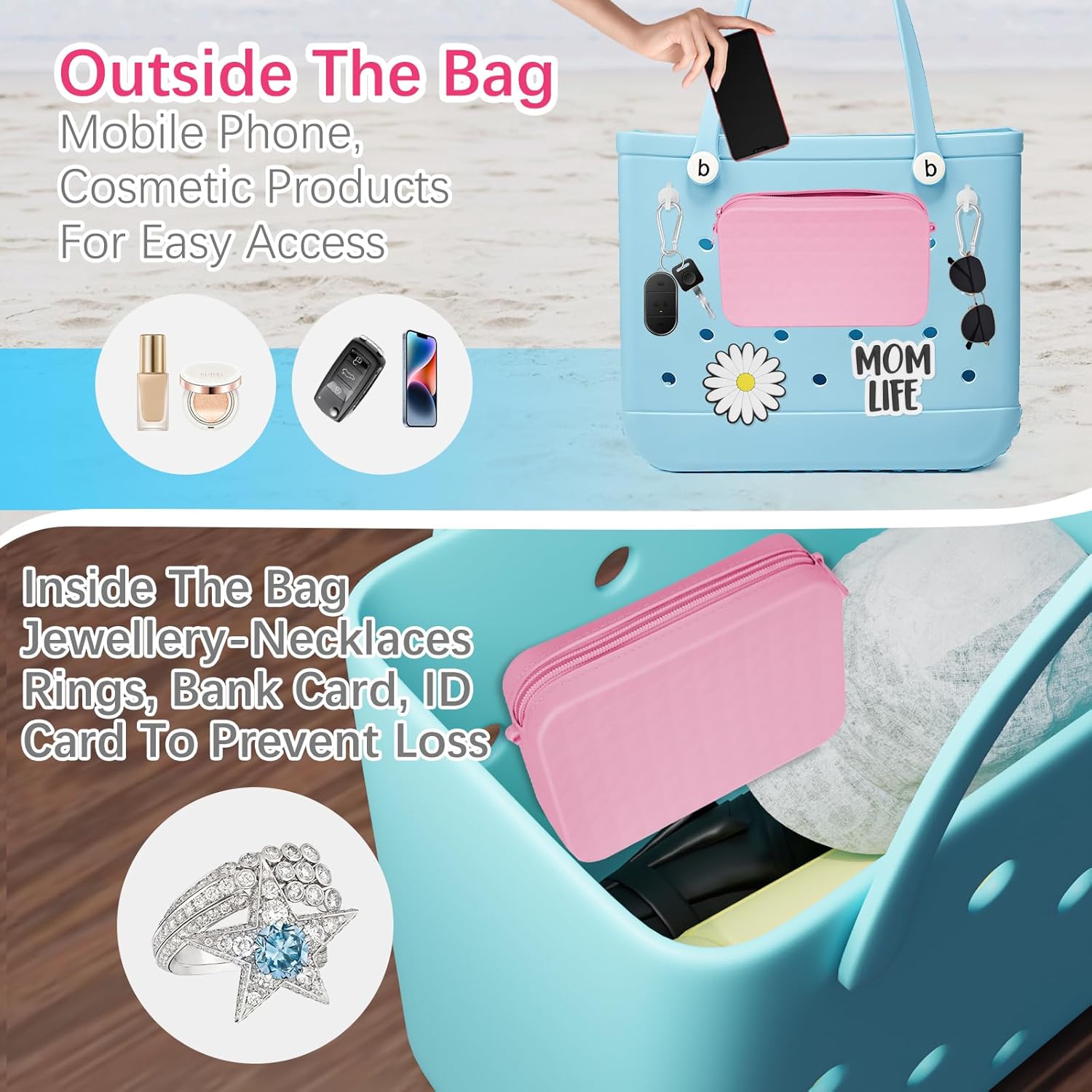 【Silicone Tote Bag】The silicone handbag is made of high-quality silicone material, which is soft and durable, waterproof and sand-proof. The zipper design can protect valuable items such as mobile phones and prevent items from being lost. The silicone handbag is perfectly compatible with the bogg bag. It can not only be placed inside or outside the bag but can also be used as a small handbag alone.
