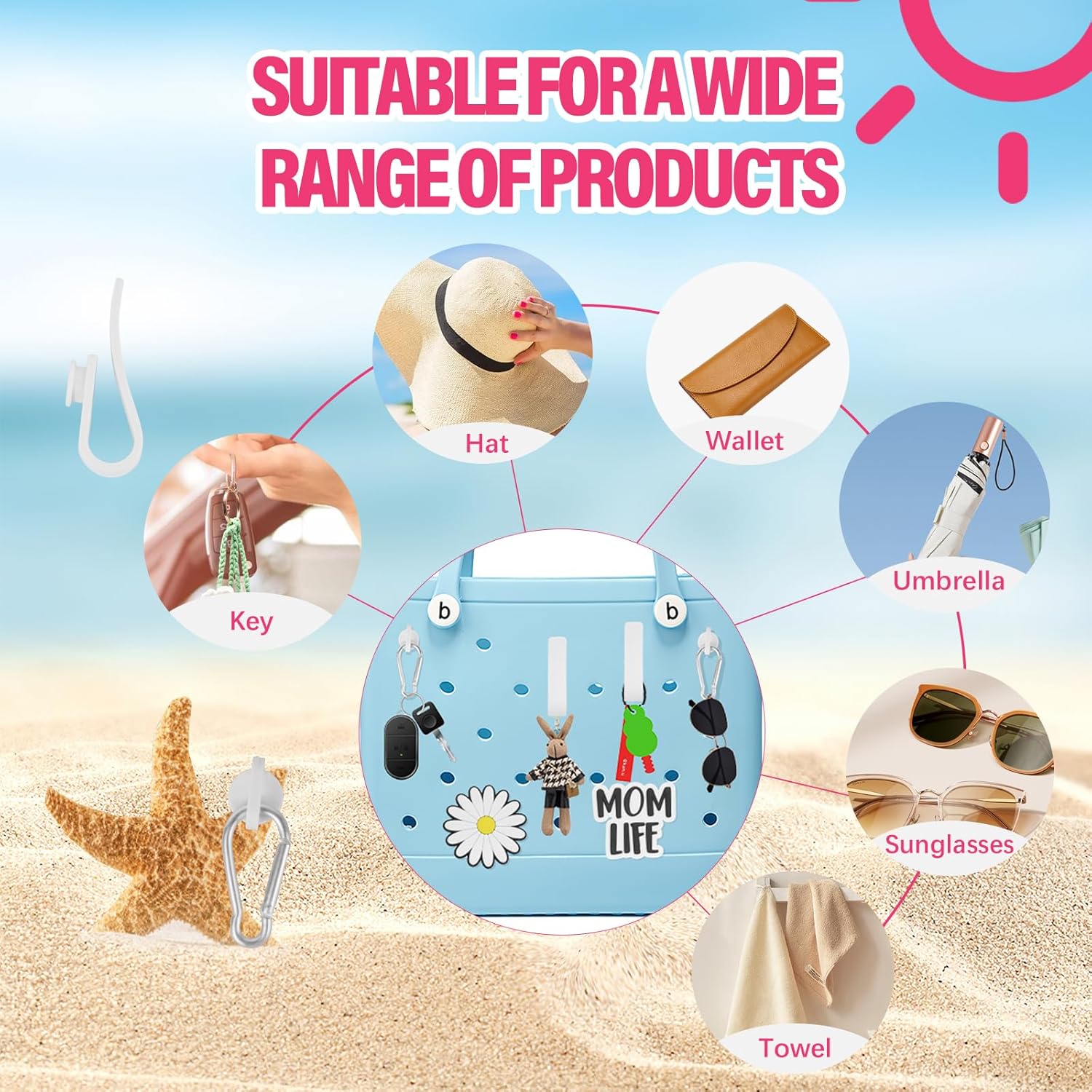 【Accessories Set for Bogg Bag】Our accessories set contains a silicone tote bag, two bogg bag charms, two clips, and two key chains. Perfectly compatible with various sizes of bogg bags and beach bags